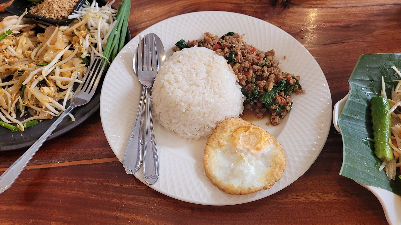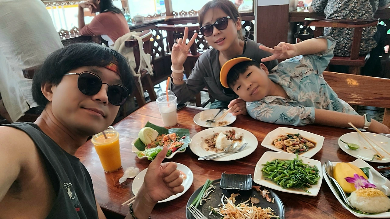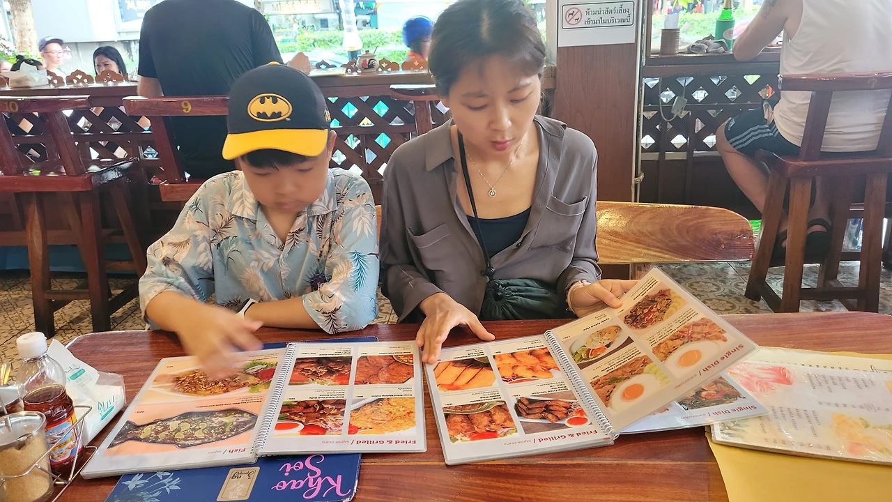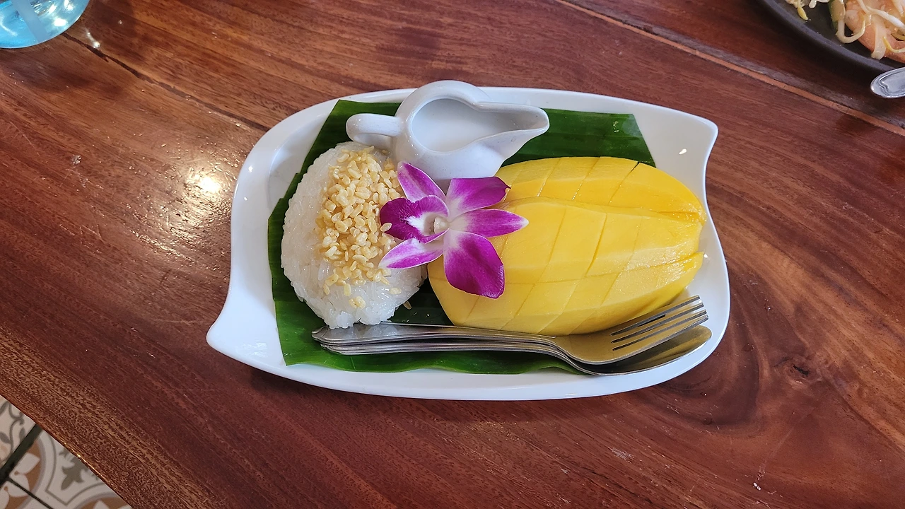 식당에 들어가니 이미 향신료 가득한 냄새가 가득 차 있어서 식욕을 더욱 돋웠다. 메뉴판을 보고 추천을 받아서 쏨땀(Som Tam), 아삭한 모닝글로리 볶음인 팟팍붕파이댕(Pad Pakboong Faidaeng), 팟타이(Pad Thai), 태국 바질과 다진 돼지고기를 넣고 볶은 팟카파오무쌉(Pad Kra Pao Moo Sap)을 시키고 태국 와서 정말 먹고 싶었던 망고 찹쌀밥까지 주문했다. 마실 것은 수박 스무디인 땡모반(Taengmo ban), 망고 스무디, 코코넛 스무디를 시켰다. 음식이 나와서 먹고 있는데 모닝글로리 볶음이 나오지 않아 다시 확인하고, 추가로 해산물 볶음까지 시켜서 배불리 먹었다. 아이는 마지막 망고 찹쌀밥 먹으면서 연유가 느끼했는지 좋은 평점을 주진 않았다. 아내는 쏨땀을 처음 먹어보고 너무 맛있다며 극찬을 했다.