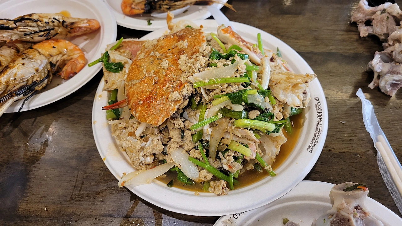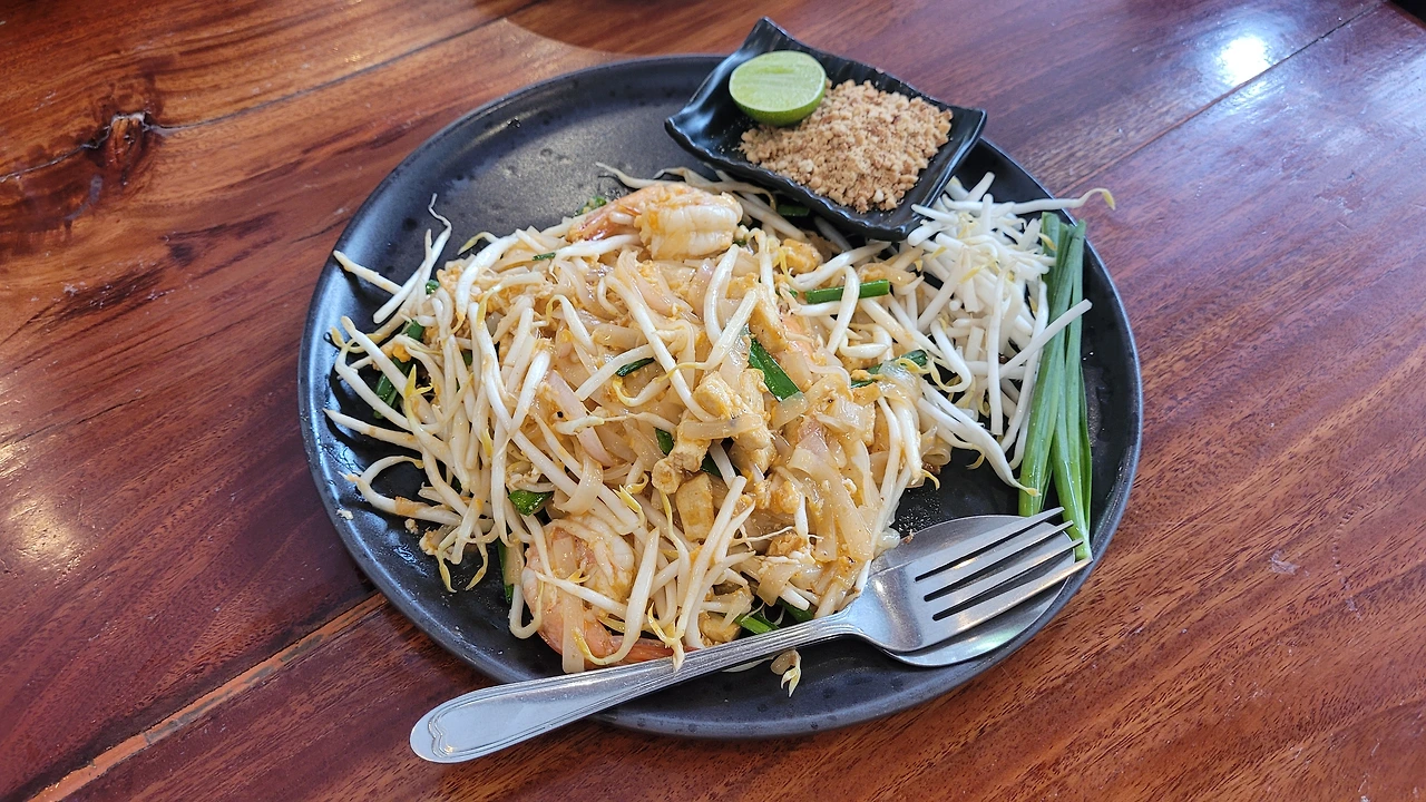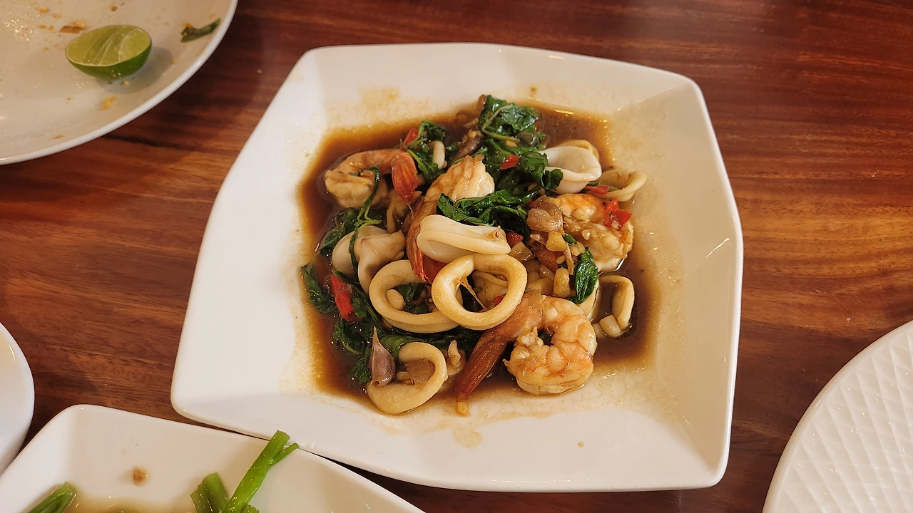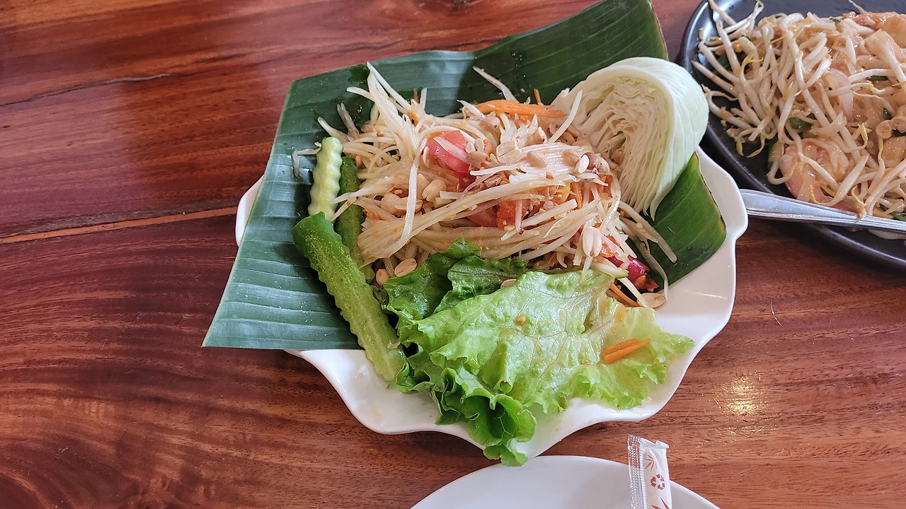 식당에 들어가니 이미 향신료 가득한 냄새가 가득 차 있어서 식욕을 더욱 돋웠다. 메뉴판을 보고 추천을 받아서 쏨땀(Som Tam), 아삭한 모닝글로리 볶음인 팟팍붕파이댕(Pad Pakboong Faidaeng), 팟타이(Pad Thai), 태국 바질과 다진 돼지고기를 넣고 볶은 팟카파오무쌉(Pad Kra Pao Moo Sap)을 시키고 태국 와서 정말 먹고 싶었던 망고 찹쌀밥까지 주문했다. 마실 것은 수박 스무디인 땡모반(Taengmo ban), 망고 스무디, 코코넛 스무디를 시켰다. 음식이 나와서 먹고 있는데 모닝글로리 볶음이 나오지 않아 다시 확인하고, 추가로 해산물 볶음까지 시켜서 배불리 먹었다. 아이는 마지막 망고 찹쌀밥 먹으면서 연유가 느끼했는지 좋은 평점을 주진 않았다. 아내는 쏨땀을 처음 먹어보고 너무 맛있다며 극찬을 했다.