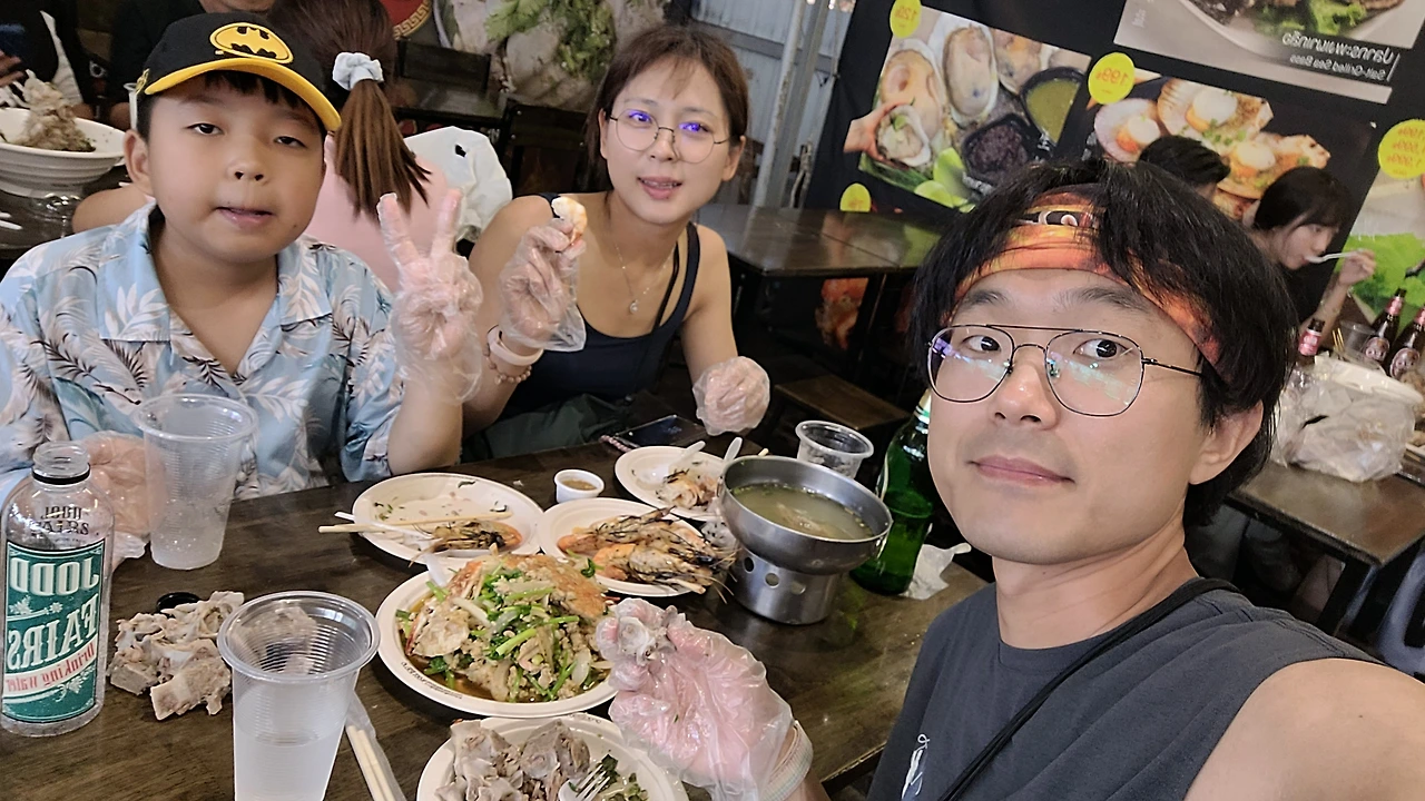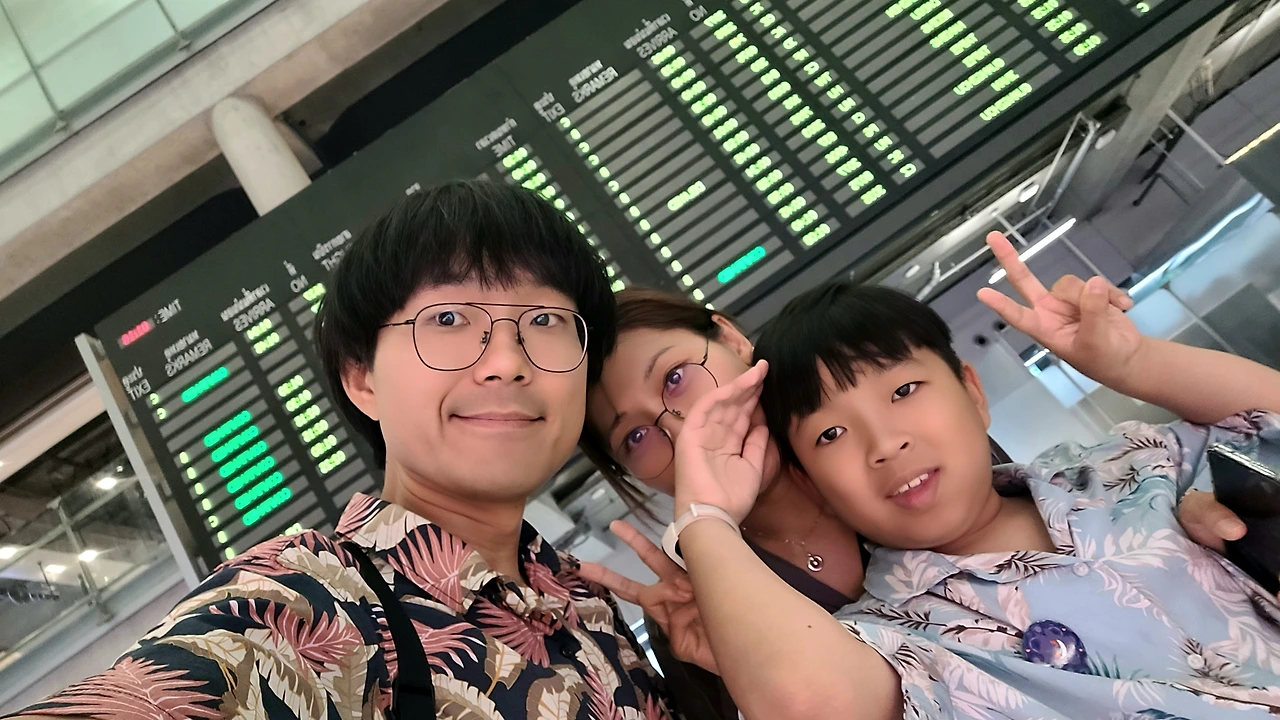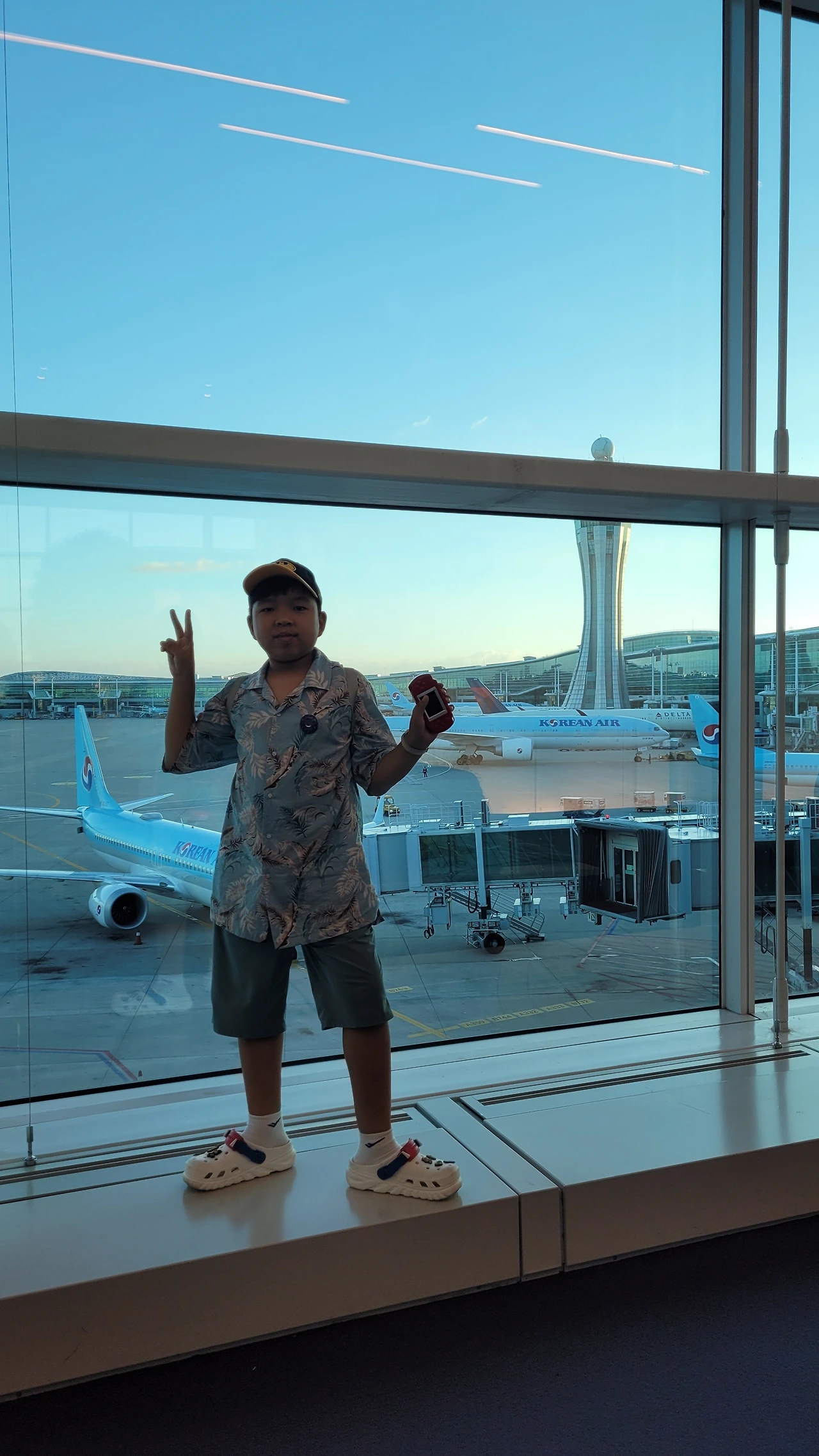 시원한 에어컨 바람 속 버스에 있다가 내린 후 더위는 느낄 새 없이 공항 안으로 들어와 먼저 환전한 돈을 찾고 출출한 배를 채우기 위해 한식 푸드코트로 갔다. 아이는 낙지차돌된장밥, 아내는 돼지고기김치찜 정식, 나는 제육볶음 정식을 시켰는데 맛은 그러려니 해서 출출한 배를 채우는 정도였다. 체크인을 하고 수화물을 맡기려고 기다리는 사이에 설사가 찾아온 아이는 공항에서 무려 8번이나 화장실을 찾아서 기운을 쏟아냈다. 도넛 가게에서 커피와 도넛을 사서 공항 라운지에서 대기하며 어머니와 통화도 하고, 잠깐 쉬는 시간을 가졌다. 시간 맞춰 탑승구에 왔을 때는 항공기 연결 문제와 공항 활주로 혼잡으로 1시간 지연이 있었고, 어둑한 밤이 되자 태국 방콕 수완나품 국제공항으로 하늘을 날았다.