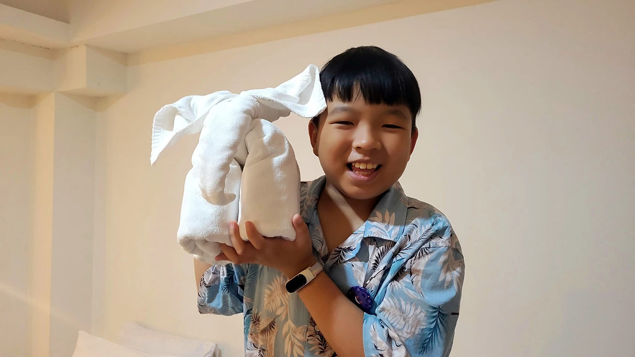 어두컴컴한 하늘을 5시간 넘게 나는 동안 미리 다운로드하여 온 영화 2편을 보고 3번째 보는 중 너무 졸려서 잠깐 잤더니 어느새 태국 하늘에 도착해 있었다. 아이는 졸린데 잠을 제대로 못 자서 그런지 계속 칭얼댔다. 드디어 태국의 허브 공항인 수완나품(Suvarnabhumi) 국제공항에 도착했다. 한국시간으로 새벽 2시가 훌쩍 넘어서 도착했는데 다른 나라 사람들도 꽤 있어서 입국자가 이 새벽에도 꾸준히 들어오고 있었다. 입국하고 공항 밖으로 나오니 활기차면서 덥고 습한 태국의 새벽 공기가 훅 코밑까지 밀려왔다. 한 10분쯤 기다렸더니 예약한 택시가 와서 바로 탄 다음 공항 근처 호텔에서 늦은 잠을 자기로 했다. 객실 안으로 들어왔더니 귀여운 코끼리와 모양을 낸 수건이 있어서 태국에 왔음을 더 실감했다. 이렇게 이동만 가득했던 태국 입국 날이 지나갔다.