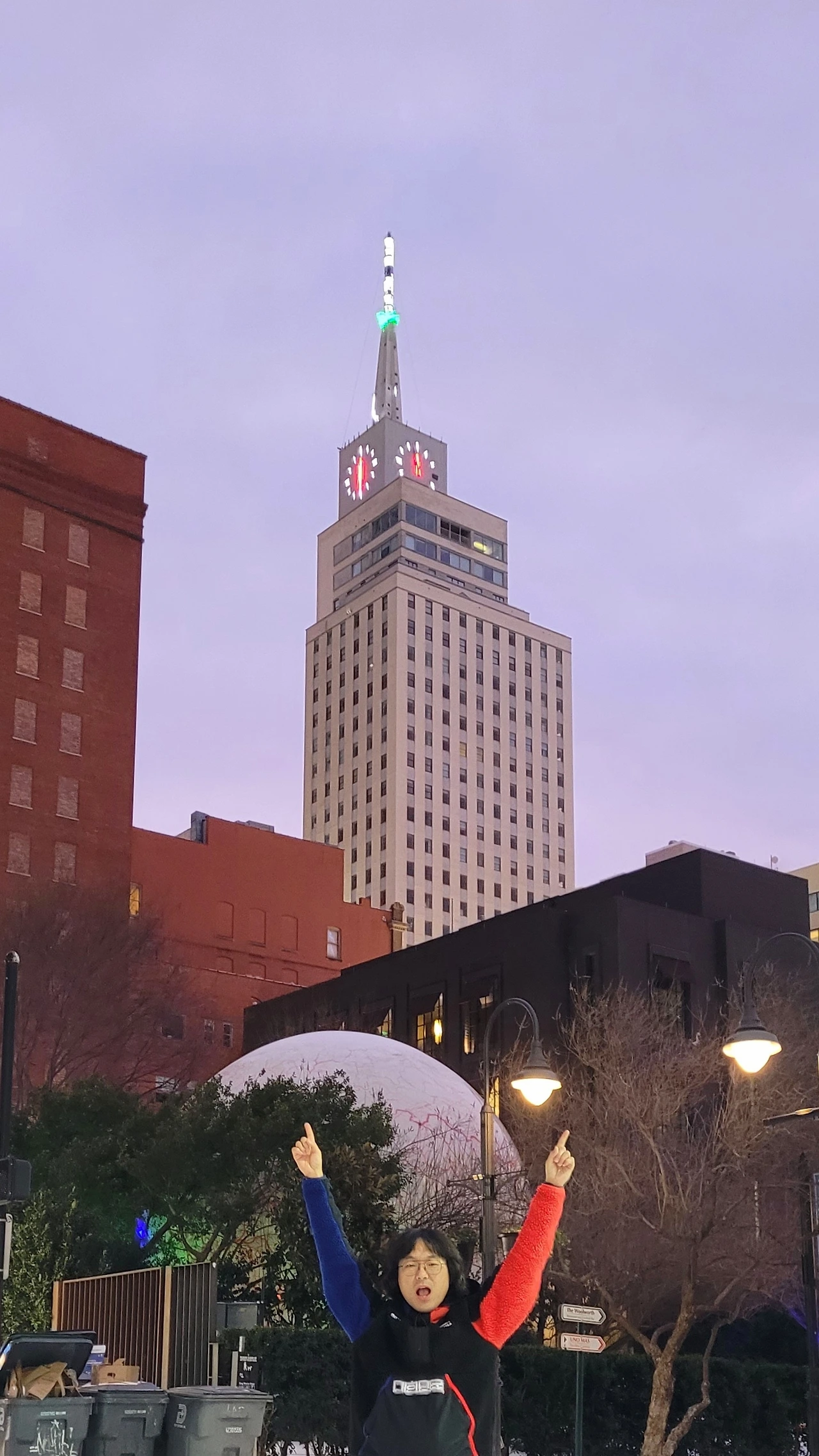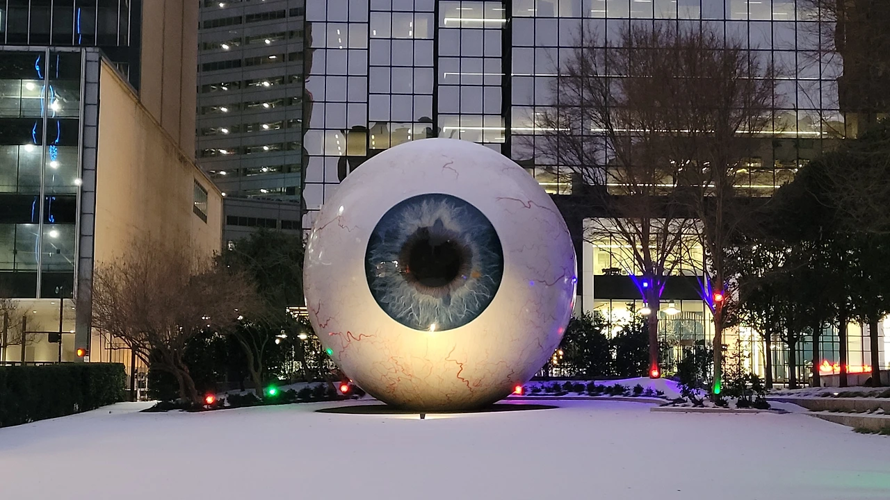 그 가게 바로 옆에는 댈러스의 명물 가운데 하나인 장 아이볼(Giant Eyeball)이 자리하고 있었다. 장 아이볼은 도심 한가운데 설치된 거대한 눈 조형물로서, 높이 약 9미터에 달하는 사실적인 눈 모형이었다. 2007년 미국 조각가 토니 타셋이 제작한 이 작품은 인간의 시선을 상징적으로 드러내며, 관람객에게 보고 있음과 보임에 대한 질문을 던지는 작품이었다. 주변의 고층 빌딩과 대비되는 초현실적인 존재감으로, 댈러스의 자유롭고 실험적인 예술 감각을 대표하는 상징이기도 했다. 텅 빈 거리 한복판에서 그 눈과 마주하니, 마치 우리가 이 도시를 지켜보는 존재인지, 아니면 도시가 우리를 응시하는 존재인지 알 수 없는 묘한 기분이 들었다.