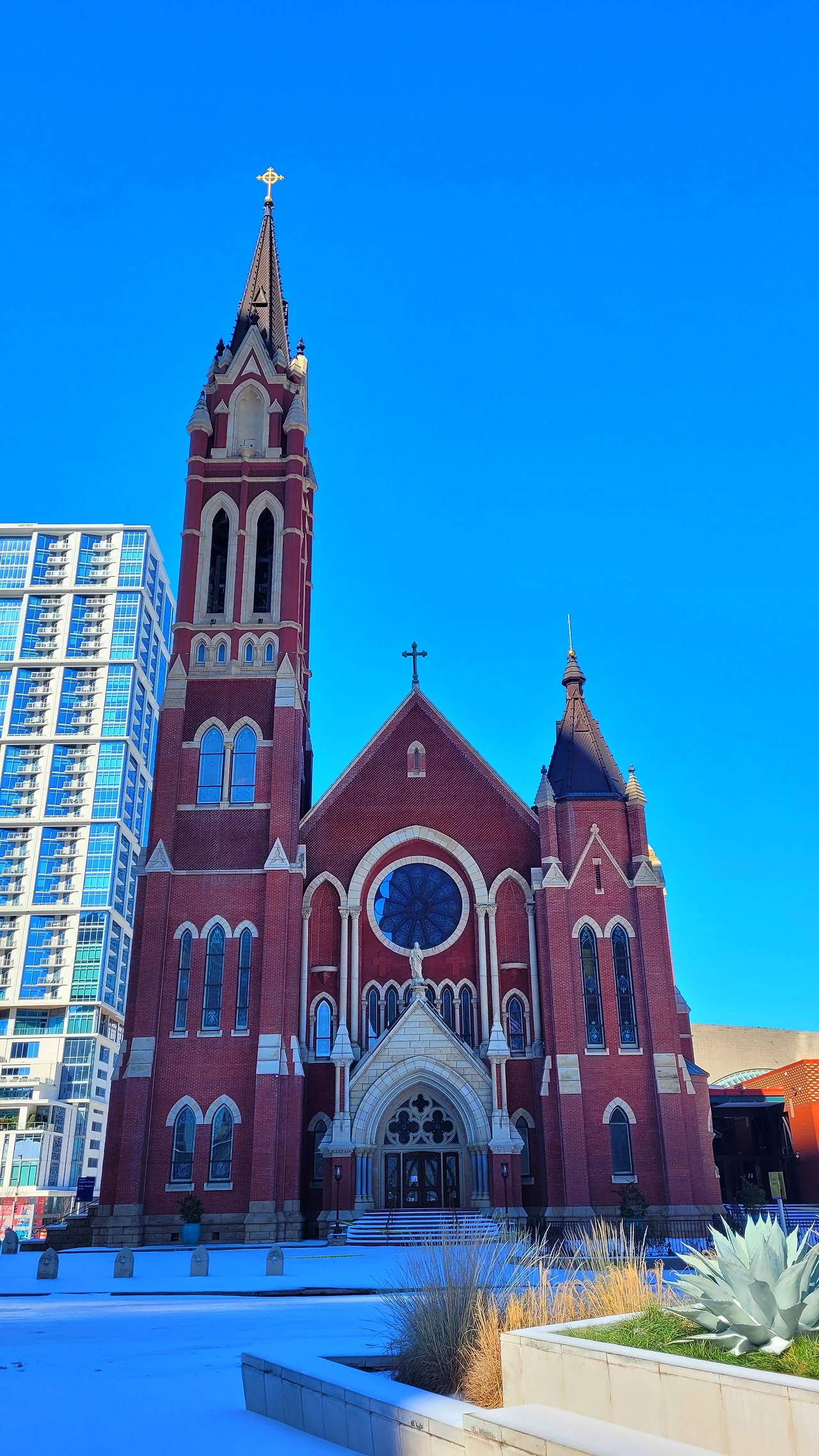숙소에서 간단히 요기를 하며 오늘 일정을 다시 짰다. 계획은 이미 의미를 잃은 상태였고, 선택만 남아 있었다. 그리고 우리는 조금 일찍 나서서 댈러스의 과달루페 대성당(National Shrine Cathedral of Our Lady of Guadalupe)으로 향했다. 이 성당은 미국 내 히스패닉 가톨릭 공동체의 중심 성당으로, 텍사스에서 가장 오래된 가톨릭 성당 가운데 하나였다. 1902년에 현재의 건물이 완공되었으며, 로마네스크 리바이벌 양식을 바탕으로 한 웅장한 외관과 화려한 스테인드글라스로 유명했다. 과달루페 성모는 멕시코와 중남미 전역에서 깊은 신심의 대상이며, 이 성당은 미국과 라틴 문화가 만나는 신앙의 상징적인 공간이었다.
