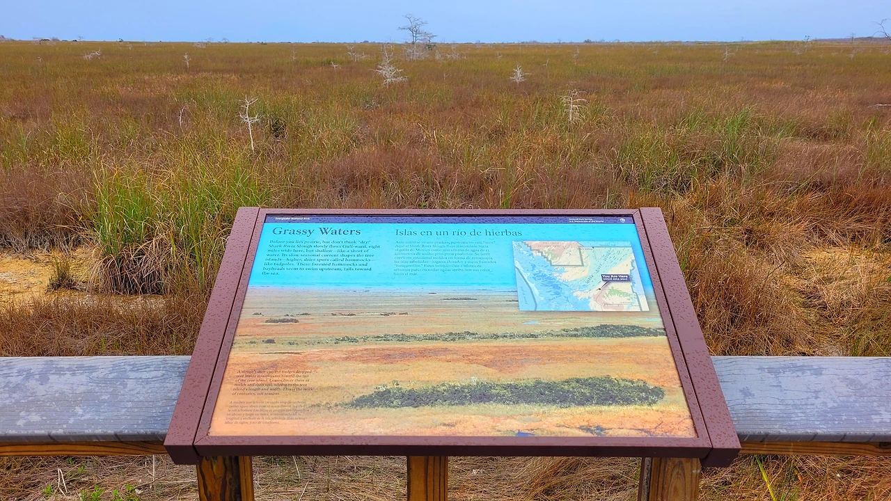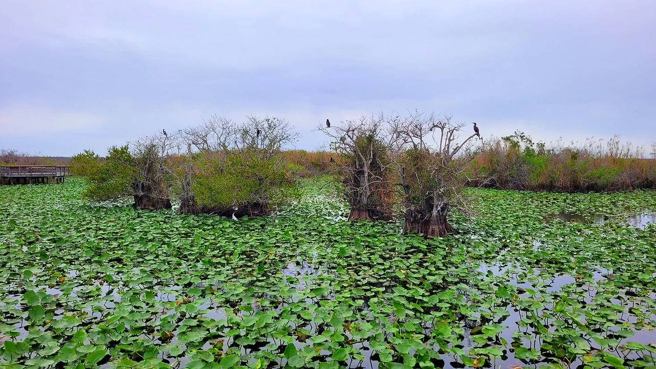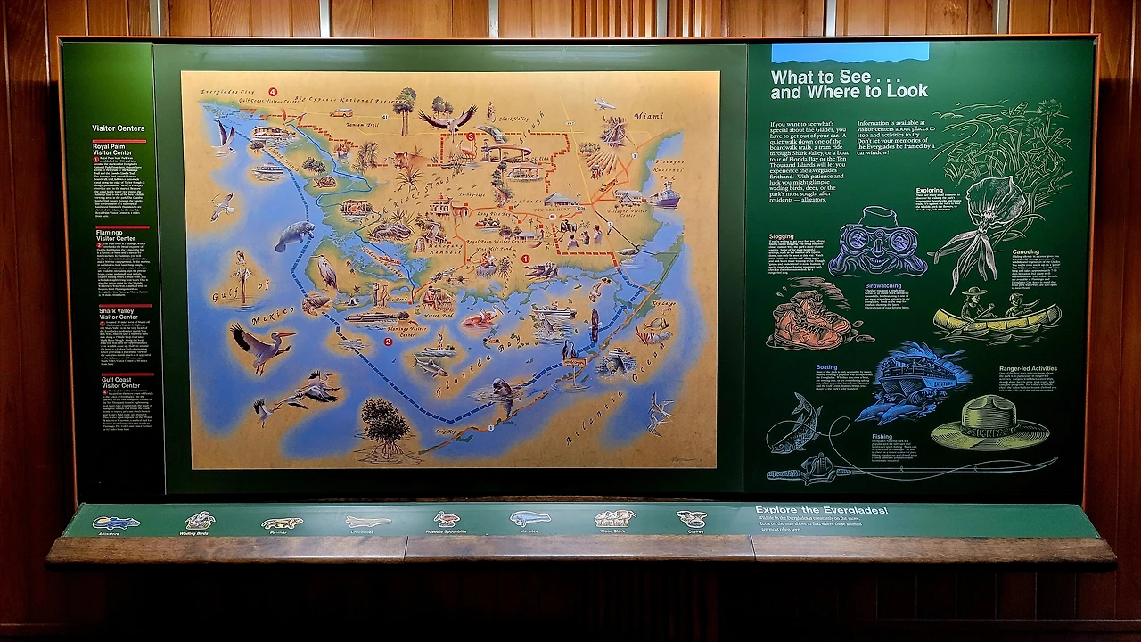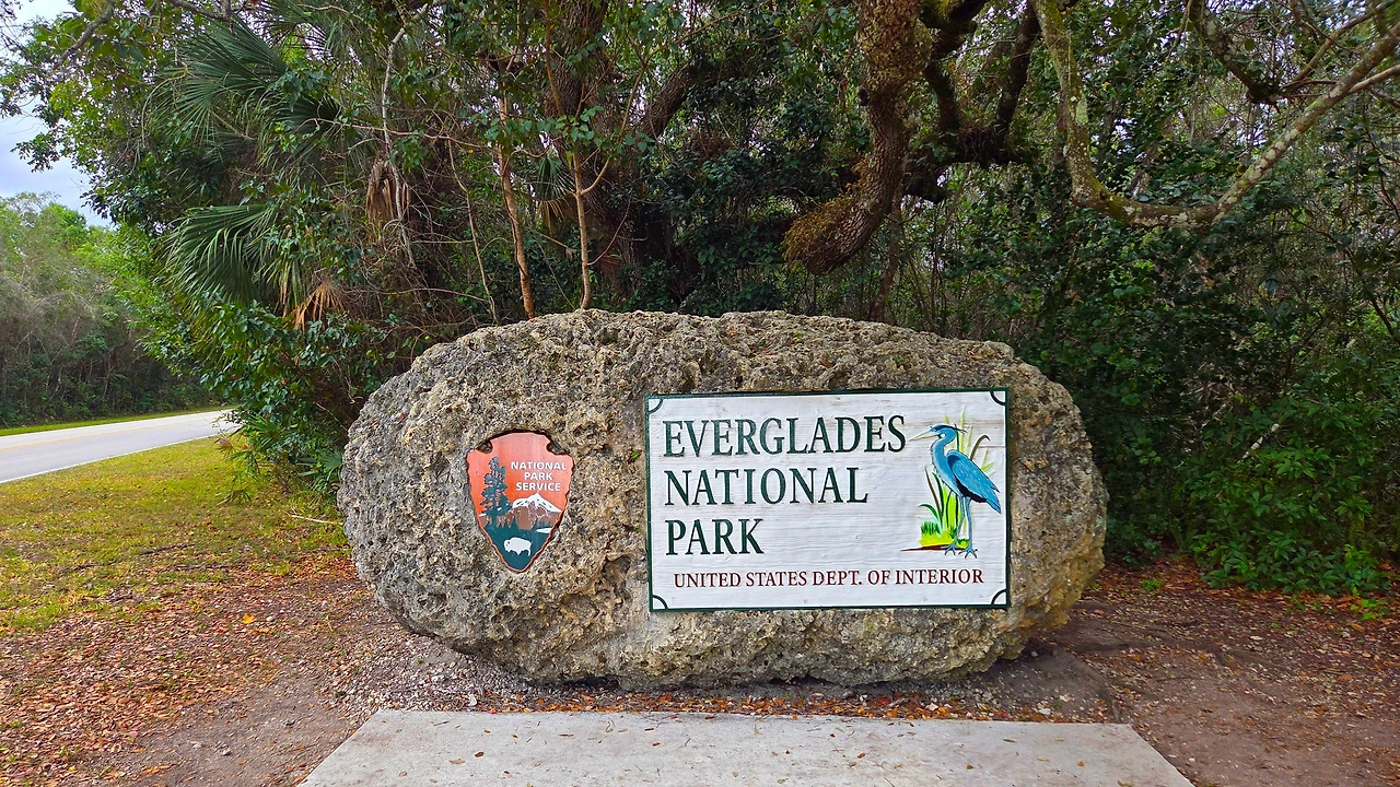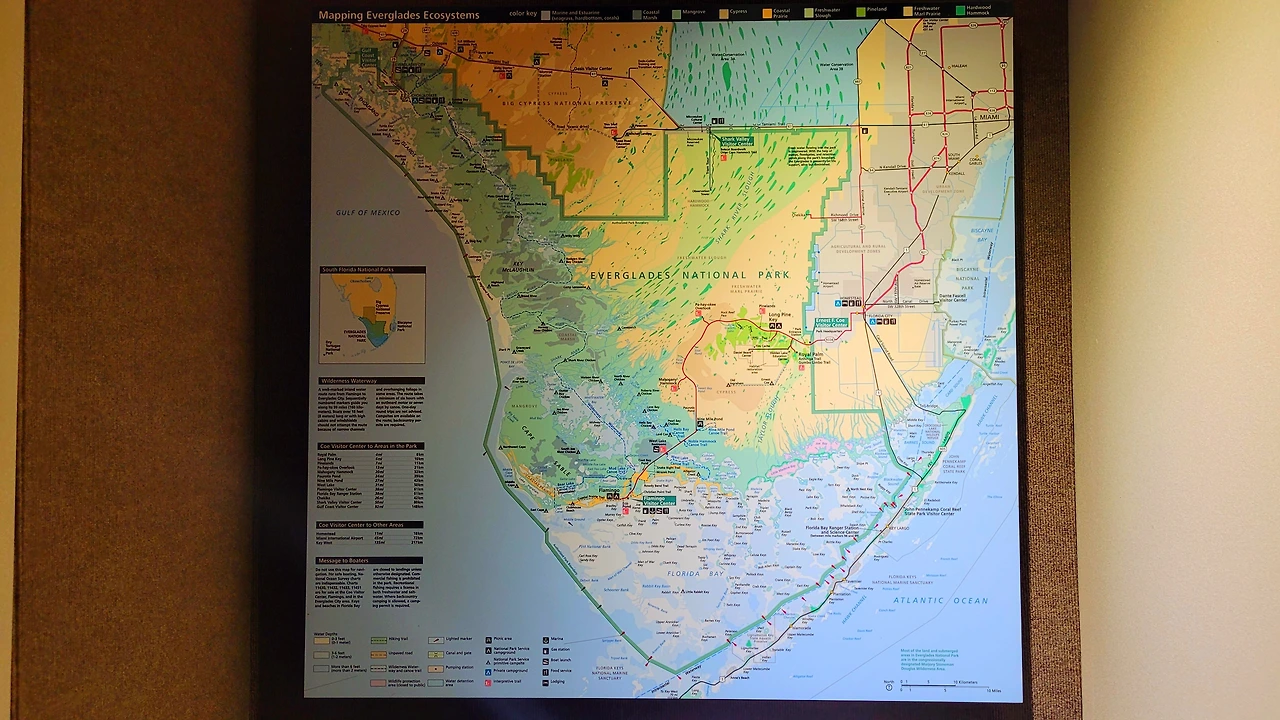 에버글라데스 국립공원(Everglades National Park)은 미국 남부 플로리다에 위치한 거대한 습지 국립공원이다. 면적은 약 6,100km²로서, 충청북도 면적보다 살짝 작은 정도였다. 이곳은 늪지와 초원, 맹그로브 숲이 어우러진 독특한 생태계를 이루고 있다. 흔히 강이라고 생각하는 물줄기는 사실상 거의 흐르지 않는 얕은 물의 평원으로, '풀의 강'이라 불렸다. 악어, 희귀한 새들과 파충류가 공존하며, 인간의 개입이 최소화된 자연의 원형에 가까운 모습을 유지하고 있었다. 미국의 국립공원이 그렇듯 이곳도 살아 있는 생태계 그 자체였다.