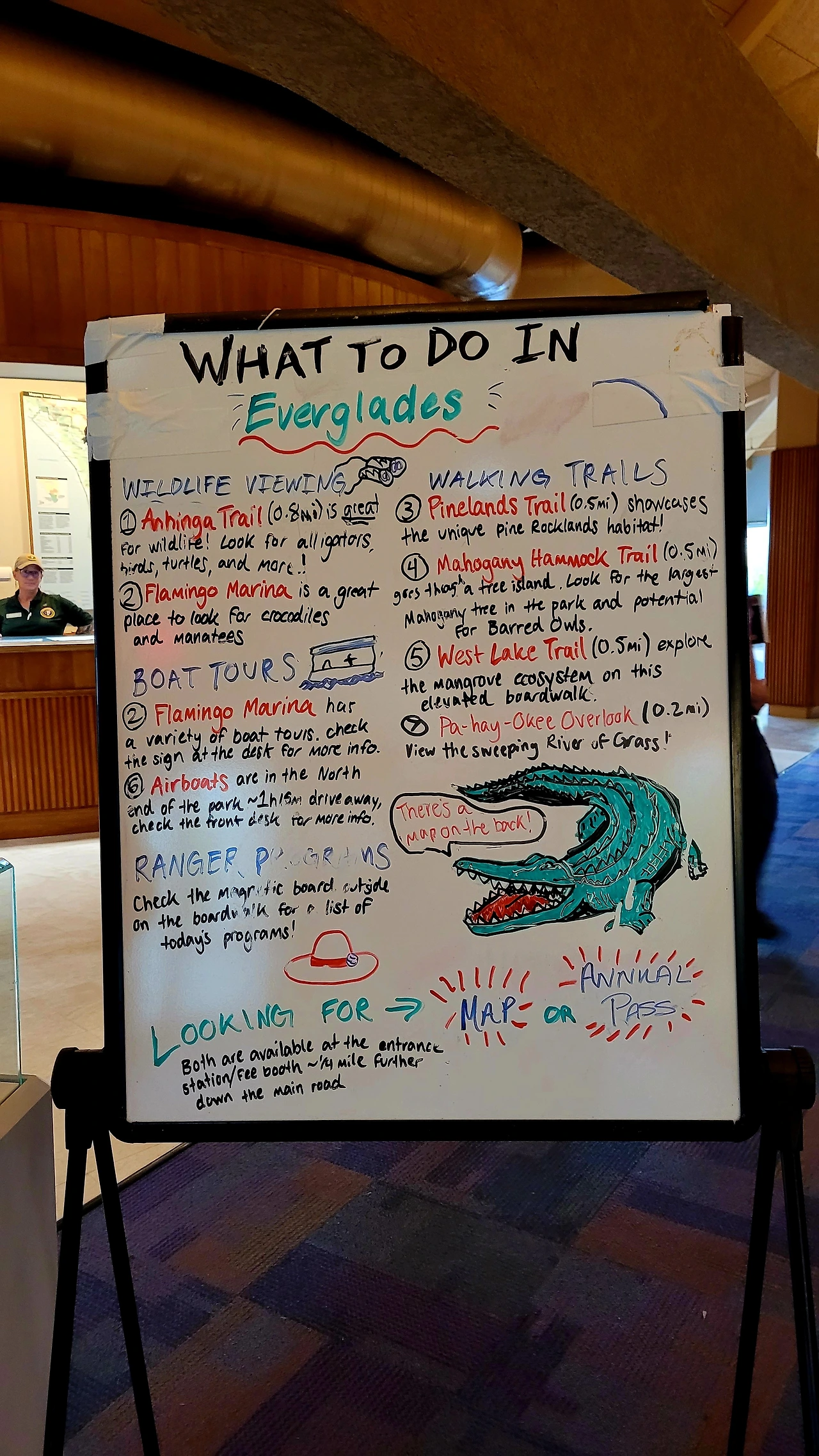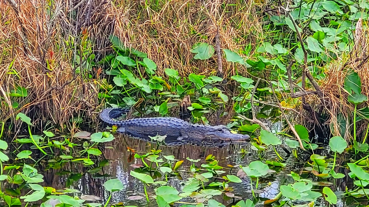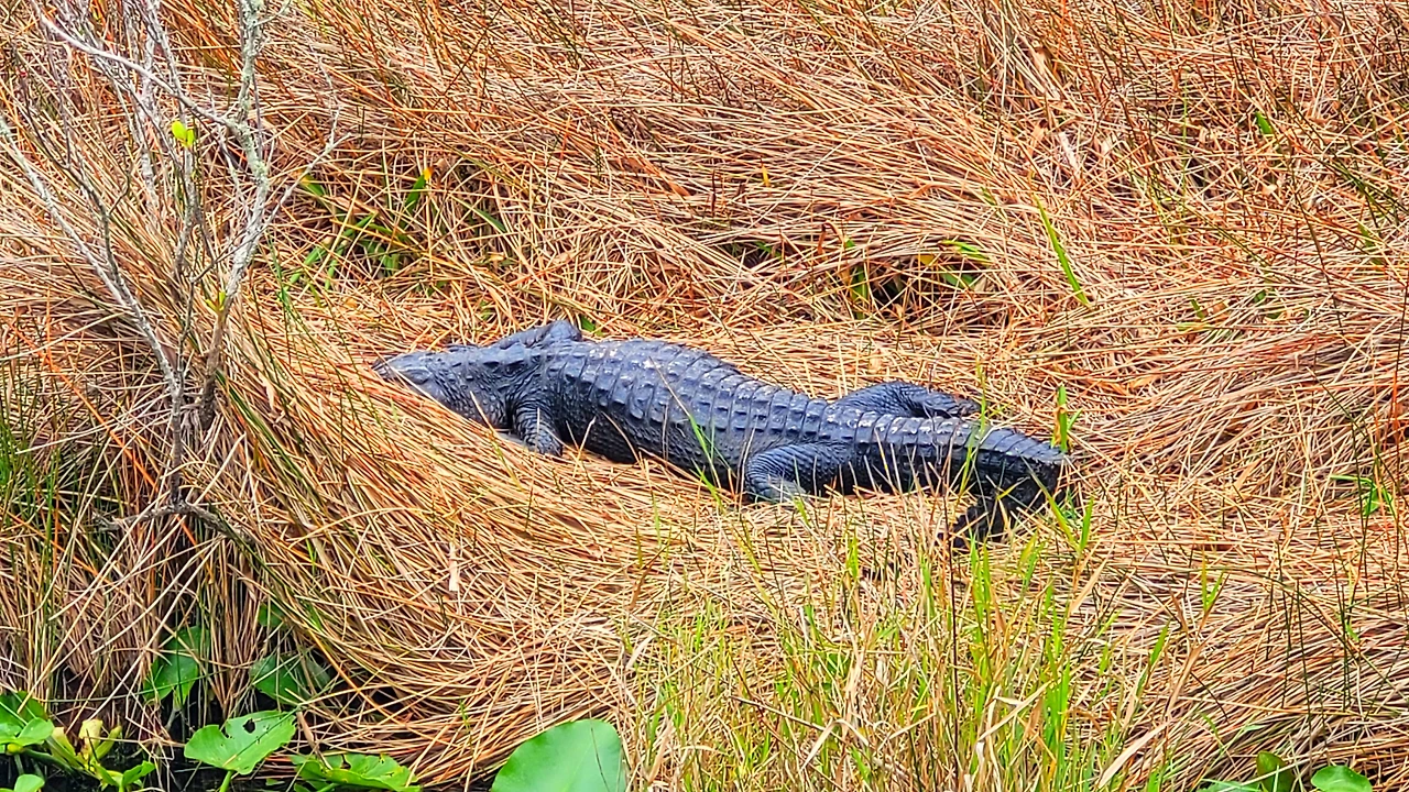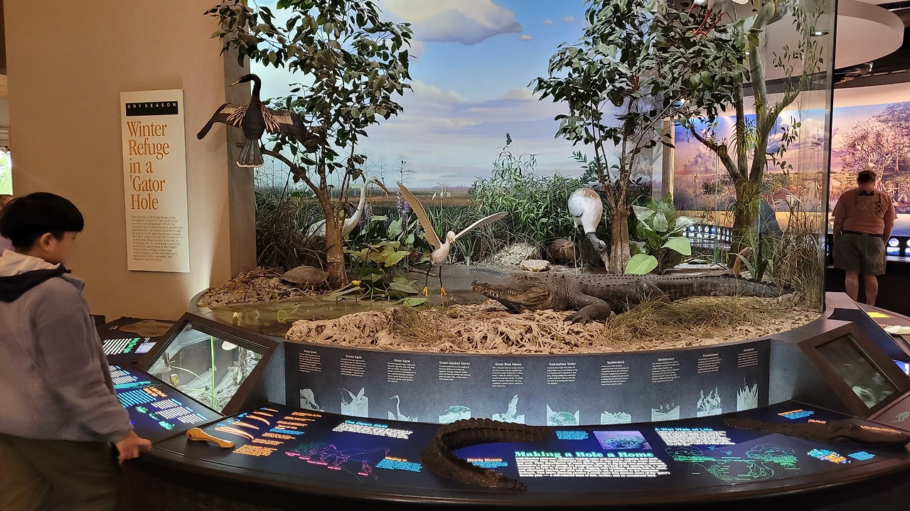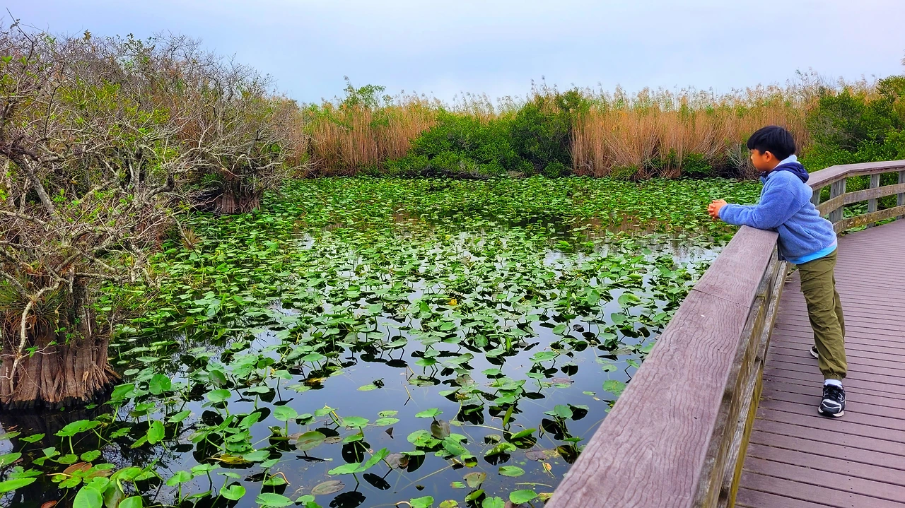 첫 번째로 향한 곳은 로열 팜 비지터 센터(Royal Palm Visitor Center)였다. 그곳에서 안힝가 트레일(Anhinga Trail)을 걸었다. 나무 데크 위를 따라 이어진 짧은 트레일은 생각보다 많은 이야기를 품고 있었다. 가이드가 동행하며 이곳에 사는 새와 악어, 식물들에 대해 세세하게 설명해 주었다. 지금 시즌이 다양한 물고기가 많아서 새와 악어들에게는 뷔페 시즌이라고 했다. 설명을 들으며 솔직히 말하면 그다지 흥미를 느끼지 못했다. 동식물학에 대해 좋아하는 편도 아니었고, 설명이 길어지면 마음이 다른 데로 흐르는 편이었다. 반면 아이는 전혀 달랐다. 눈을 반짝이며 질문을 던지고, 안내를 놓치지 않으려 애썼다. 그 모습을 보며 이 여행이 아이에게 어떤 기억으로 남을지 상상해 보았다.