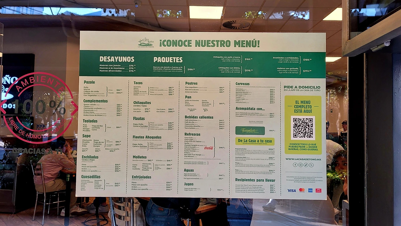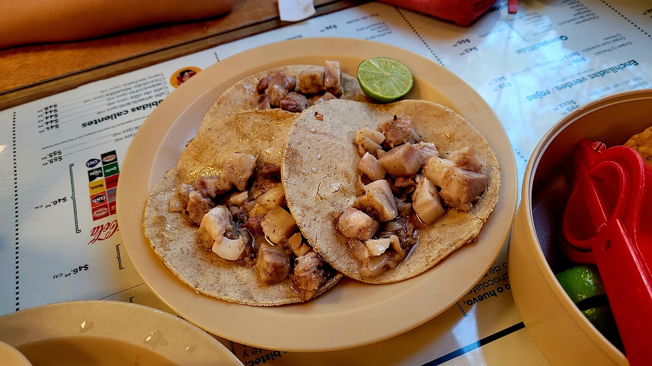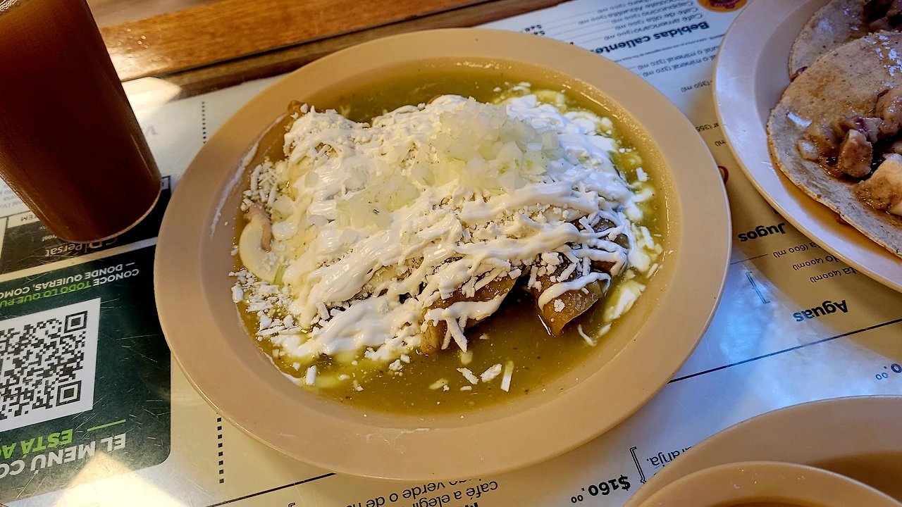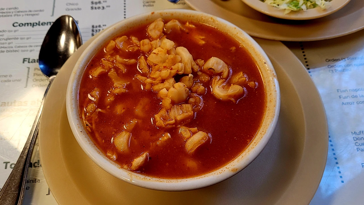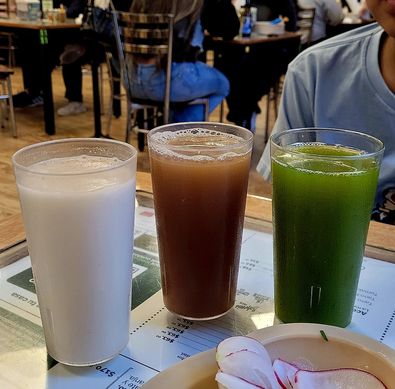 식당은 만석이었지만 회전이 빨라 오래 기다리지 않고 들어갈 수 있었다. 메뉴판은 전부 스페인어였고, 직원들도 영어를 거의 하지 못했다. 번역 어플과 짧은 영어, 손짓을 섞어 주문을 마쳤다. 포솔레(Pozole) , 엔칠라다 (Enchiladas), 타코(Tacos), 볼리요(Bolillo)와 함께 음료로 오르차타(Horchata), 타마린도(Tamarindo), 그린 주스(Jugo verde)를 시켰다. 디저트로는 카페 데 오야(Café de olla), 플란 나폴리타노(Flan napolitano),
