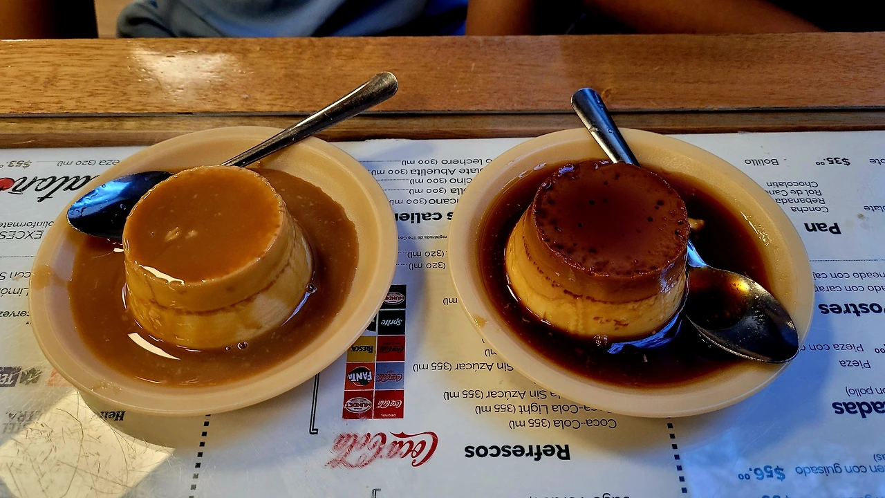 식사 후에 디저트로 주문한 카페 데 오야(Café de olla)는 커피를 냄비에 끓여서, 필론시요라고 불리는 흑설탕, 계피를 넣어 달콤하고 향긋했다. 플란 나폴리타노(Flan napolitano)는 부드러운 커스터드푸딩 위에 캐러멜이 얹힌 디저트로 익히 아는 그 모습이었다. 플란 데 라 아부엘라(Flan de la abuela)는 할머니의 푸딩이라는 이름답게, 더 전통적인 맛이었다. 캐러멜 대신 카헤타(염소젖 캐러멜)가 들어가 깊고 진했다.