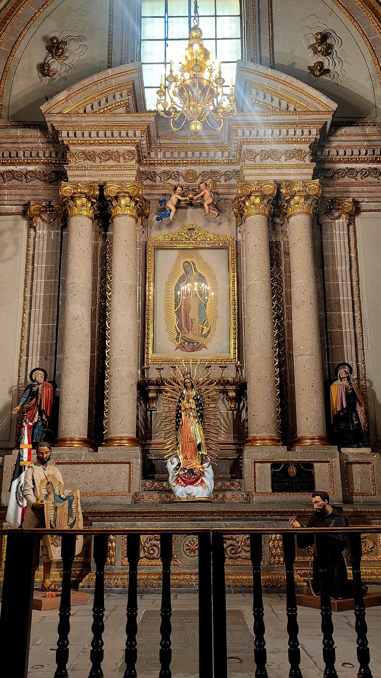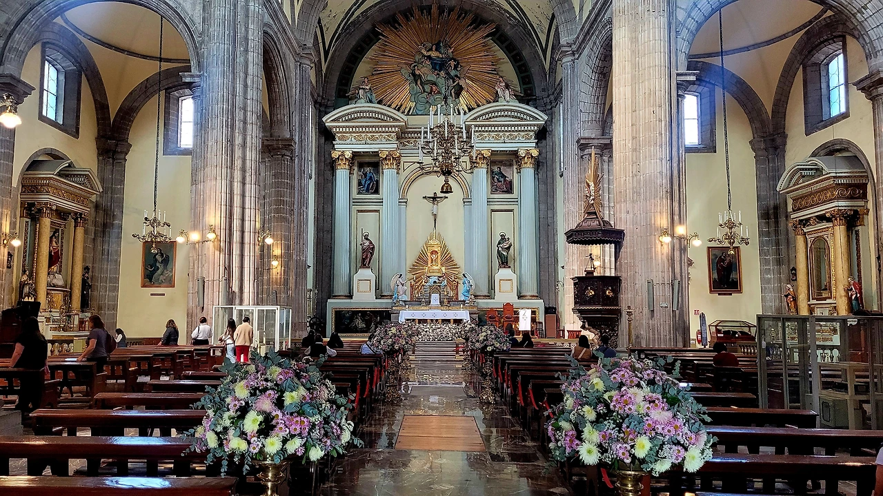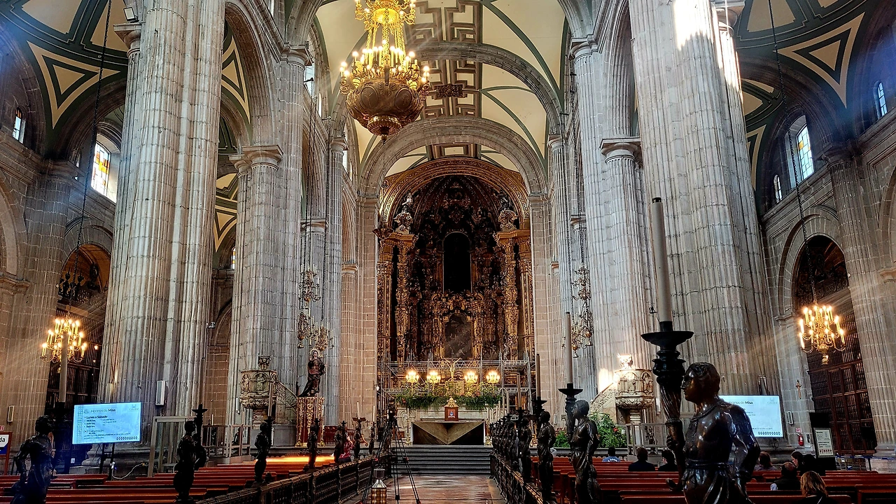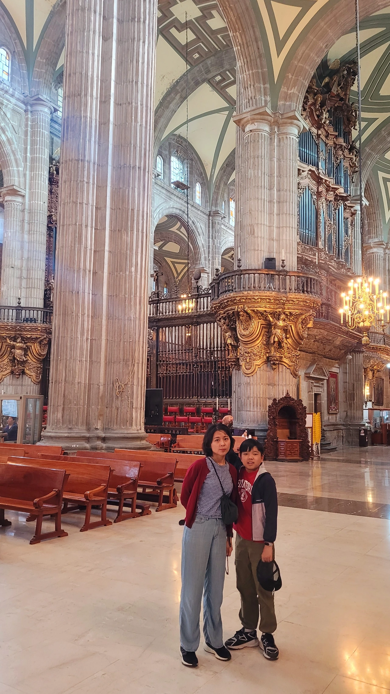 잠시 쉼표를 찍은 뒤 멕시코시티 메트로폴리탄 대성당(Catedral Metropolitana de la Ciudad de México)으로 향했다. 볕이 좋아 걷기 좋은 오후였다. 대성당으로 가기 전에 성 펠리페 네리 성당이 있어서 들어가 보니 유럽의 여느 성당 못지않게 화려하지만 고요한 분위기를 풍겼다. 잠시 기도를 드리고 나와서 다시 걷자 멕시코시티의 센트로에서도 중심인 메트로폴리탄 대성당이 보였다. 처음에 들어가는 정문을 못 찾아서 옆문으로 들어갔는데, 그곳은 대성당과 붙여있는 사그라리오 메트로폴리타노 성당이었다. 이 대성당은 아메리카 대륙에서 가장 크고 오래된 성당 중 하나로서, 스페인 식민지 시대의 신앙과 권력이 응축된 공간이었다. 고딕과 바로크, 르네상스 양식이 혼합된 내부는 장엄하면서도 무게감이 있었다. 수세기 동안 이어진 기도와 침묵이 공간에 스며 있는 듯했다.