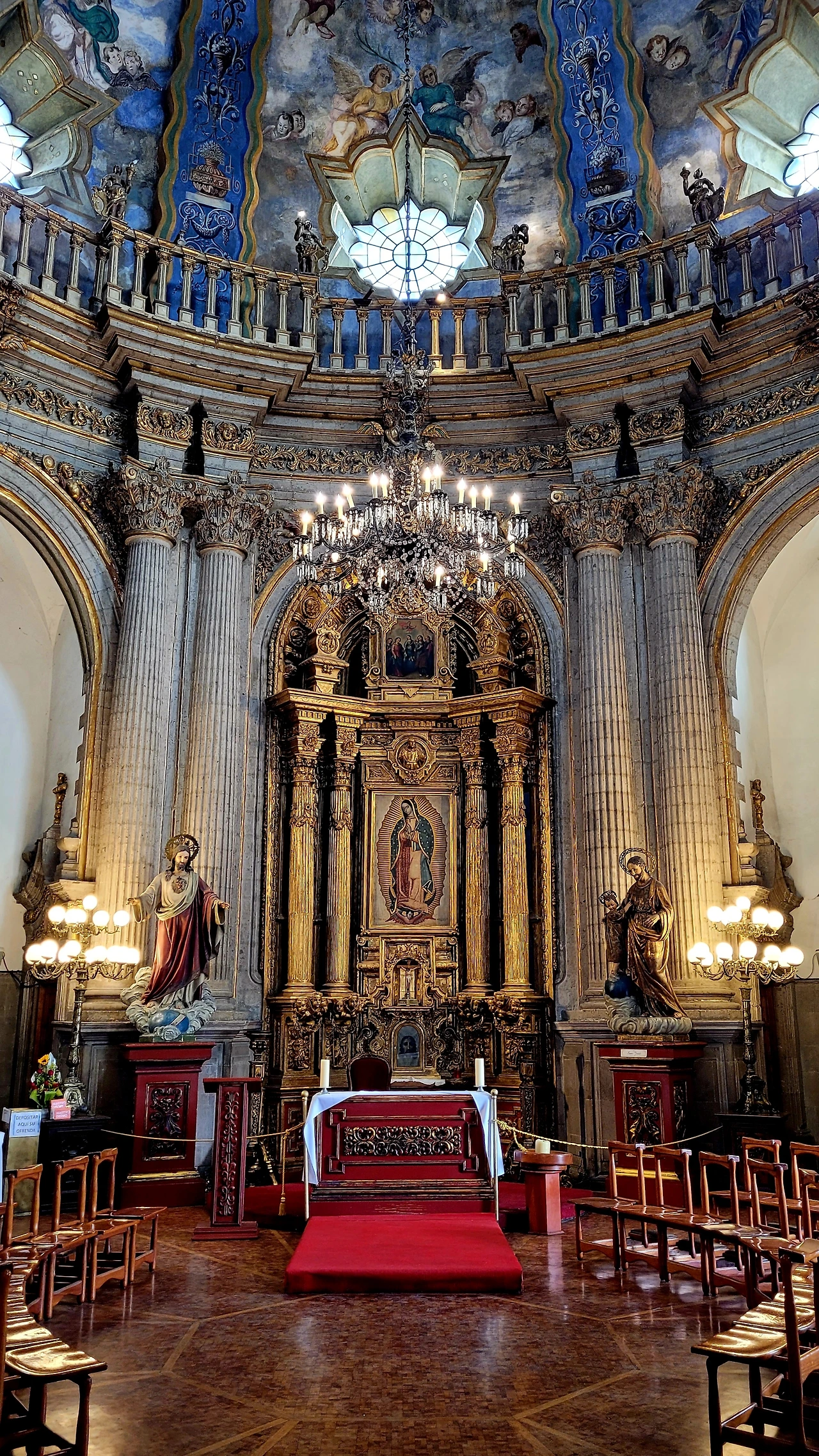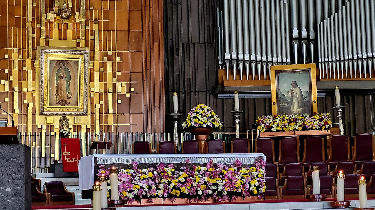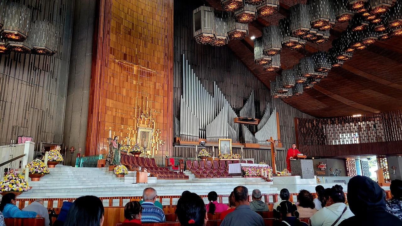 이 대성당은 1976년에 완공된 현대식 성당으로 한 번에 수만 명을 수용할 수 있는 규모를 자랑했다. 원형 구조의 내부는 어느 자리에서도 제단과 성모상을 바라볼 수 있도록 설계되었다. 제단 뒤편에는 바로 그 틸마에 새겨진 과달루페 성모상이 모셔져 있다. 미사에 참례하며 그 성모상을 직접 바라보는 순간에 긴 설명이나 해석이 필요 없었다. 신앙이라는 것이 결국 이 조용한 떨림에서 시작된다는 생각이 들었다. 경이로운 순간이었다. 많은 사람이 오가고 있었지만, 그 앞에서는 저마다의 침묵이 지켜지고 있었다.