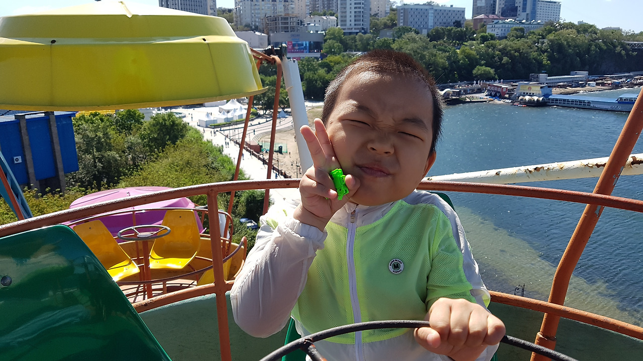 그리고 아이에게 있어서는 이번 여행의 하이라이트인 해양공원 놀이동산에 갔다. 크기는 생각보다 많이 작았지만 인구 60만 도시에 있는 놀이동산 규모로 아기자기하게 있을 건 다 있었다. 사람들은 별로 없고 있다면 대개 러시아 부모와 아이들이었다. 한국인은 우리만 있는 듯했다. 먼저 매표소에서 카드 충전을 하고 타는 방식이라 2,000 루블(4만 원)을 충전하고 신나게 탔다. 처음에 2,000 루블을 충전해달라고 하니 매표소 직원이 놀라면서 진짜냐고 물어봤다. 아마 이렇게 많이 충전하고 타는 사람이 없어서 놀랐나 보다. 아이가 놀이동산에서 많은 놀이기구를 타고 싶어 해 오전에 시간을 내어 충분히 놀기로 한 거라서 마침 사람들도 별로 없으니 정말 재미있게 놀았다. 첫 번째로 탔던 관람차는 바람막이가 없다고 해서 해양공원 명물이라고 한국인들 사이에서는 소소하게 유명했는데 정말 타보니 가림막은커녕 안전벨트도 헐거운 오픈된 방식이라 신기하고 다소 놀라웠다. 아이는 무서워하지 않고 오히려 흥분되었는지 올라가면서 소리도 지르고 재미있어했다. 그리고 범퍼카를 타러 갔는데 우리와 러시아 아버지와 아이 해서 두 팀이 그 넓은 공간을 다 썼다. 처음에 아이가 본인이 액셀을 밟겠다고 해서 시켰는데 조종하는 법을 몰라 벽에 엄청 부딪히고 그 러시아 부자가 탄 범퍼카에도 몇 번 부딪혔다. 나도 오랜만에 탄 범퍼카라 조종이 서툴렀는데 그쪽 아버지도 그런 듯했다. 서서히 감을 익히고 왔다 갔다 하는 감을 익히니 아이도 충돌의 충격에서 벗어나 즐기기 시작했다. 이곳에서 수중 범퍼카, 회전목마, 꿀벌 비행기, 꼬마 기차, 자동차 운전 등 우리나라였으면 기다리고 기다리며 탔을 놀이기구를 기다리지도 않고 바로 타면서 여러 번 많이 탔다. 충전한 카드에서 결제되는 방식이라 잔액이 얼마 남았는지 몰라 확인하러 매표소에 가서 통역 어플을 활용해 의사소통하며 확인받아서 잔액 없이 잘 놀았다. 오전 내내 놀아 시간을 보니 2시간 정도 놀이동산에서 논 것 같았다. 어느덧 오후 1시 반이 돼서 점심 먹으러 저녁식사로 골랐던 가게를 미리 갔다. 찾는데 좀 헷갈렸는데 여기서는 조지아식 만두랑 송아지 스테이크를 골랐다. 양고기 볶음밥도 시켰는데 이건 좀 양 냄새가 나고 별로 였다. 아이는 가리는 것 없이 잘 먹어서 다행이었지만 솔직히 만족스럽지는 못했다. 종업원이 입에 맞냐고 물어봤는데 길게 대화하기 힘들어서 맛있다고 하고 나왔다.