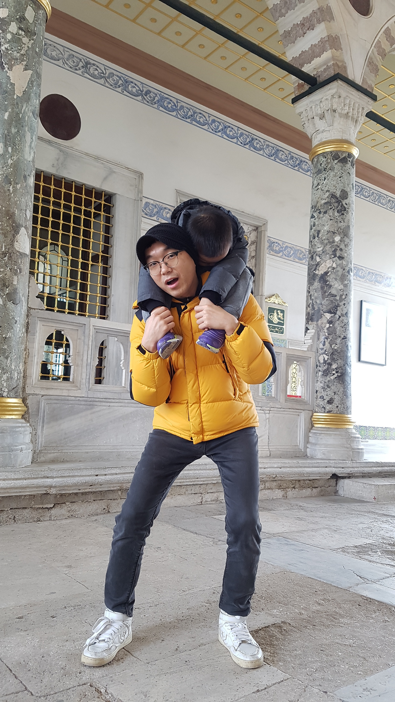 모스크에서 나와 이어 우리나라 경복궁에 비견되는 톱카프 궁전으로 발걸음을 돌렸다. 톱카프 궁전은 오스만 제국의 전성기를 잘 보여주는 궁전으로 하렘으로 특히 유명하다. 보스포루스 해협이 보이는 곳에 위치한 궁전으로 가기 전부터 그 크기에 대해 기대를 잔뜩 했는데 크기는 넓었지만 생각보다 넓지는 않았다. 나도 전제 왕권의 역사를 가진 나라 출신이다 보니 이러한 왕궁의 크기에는 익숙한가 보다. 한때 거주 인원이 5만 명이 넘었다고 하는데 실제로 술탄이 거주하고 신하 및 관료들이 오가던 곳이었기에 사람이 살았던 흔적이 지금도 곳곳에 묻어났다. 가장 기대가 되었던 하렘은 남성 출입이 금지된 여성의 공간인데 술탄과 남성 기능이 없던 환관들만 출입이 가능했다고 한다. 안에 들어가니 일단 긴 복도와 방들이 등장했다. 빛이 잘 들어오는 공간들은 아니라서 굉장히 답답하고 이곳에만 살았던 사람들은 풍족하게 살았을지언정 자연의 공기를 마음껏 마시지 못했기에 속박된 자유에 안타까운 마음이 들었다. 그곳에 자유를 저당 잡힌 아름다운 여성들과 함께하던 술탄의 권력은 동방에 대한 그릇된 환상을 서양인들이 품기에 충분한 듯했다. 아이는 넓은 궁전을 걷는 것이 재미없는지 칭얼대고 힘들어하기도 했다. 그래서 주로 내가 목마를 태워 다녔다. 그러자 내 어깨 위에서 목을 부여잡고 잠을 청하기도 했다.