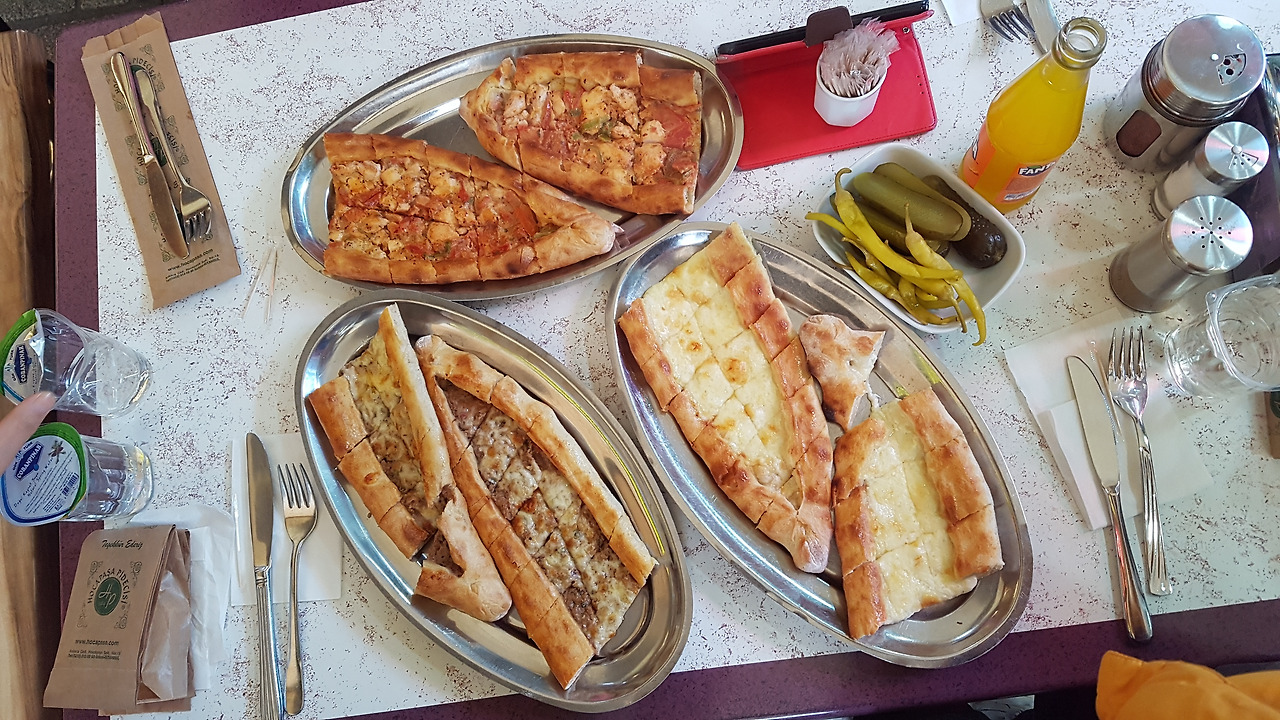 박물관 관람을 끝낸 다음에 터키의 피자라고 할 수 있는 피데를 먹으러 갔다. 이미 점심시간이 돼서 그런지 식당가에는 많은 사람들이 식사를 즐기고 있었다. 그런데 어제부터 느낀 거지만 식당 종업원들이 거의 다 남자들이었다. 여자가 서빙을 보는 식당도 있겠지만 시내에 있는 식당들 종업원은 내가 본 것은 거의 남자들이라 이것이 또 색다르게 느껴졌다. 식당가에서 맛있어 보이는 피데 집에 들어갔다. 피데는 터키의 피자로 할 수 있는데 모양은 바게트처럼 다소 길어서 타원형으로 생겼고 가장자리는 말아 올려있다. 그리고 그 안에 각종 토핑과 치즈를 넣어 구운 음식이다. 가격도 저렴하고 건강한 맛이 느껴지는 일품 음식이었다. 치즈, 고기, 토마토로 종류별 1개씩 주문을 해서 다들 맛있게 먹었다. 촉촉이 늘어지는 치즈와 빵 도우의 식감이 쫄깃하고 안에 담긴 고기, 토마토 등 재료도 신선하게 입안에서 맴돌았다. 식사를 한 후에는 디저트로 터키 티와 터키 커피를 시켜서 마무리했다. 터키 티도 참 많이 먹었다. 일상적으로 이스탄불 사람들은 뜨겁게 우린 홍차에 설탕을 넣어 많이 먹었다. 현지인 식사를 좋아하기에 그렇게 우려낸 홍차와 묵직한 커피를 자주 우리도 애용했다. 커피는 바로 먹으면 안 되고 시간을 조금 두고 마셔야 했다. 안 그러면 곱게 간 원두까지 다 먹어버리기 때문에 가라앉기를 기다려야 했다. 다 마신 커피는 뒤집어 점을 본다는 데 뒤집은 찻잔은 꾸덕한 커피 찌꺼기에 더러워지기만 할 뿐이었다.