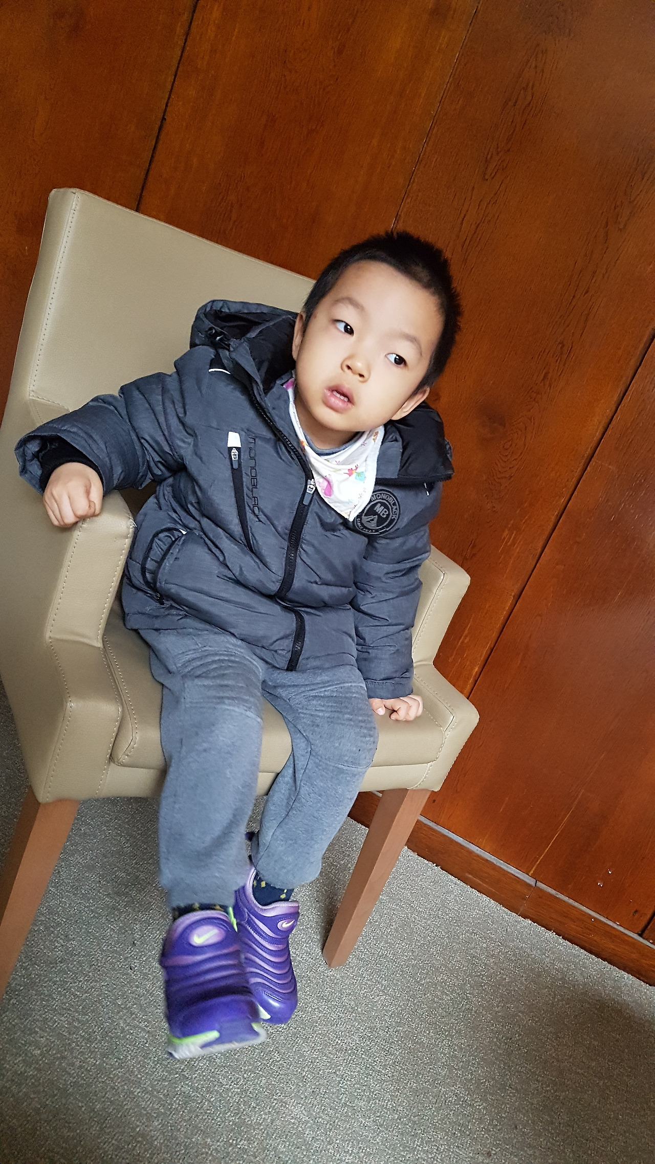 다리가 아파서 앉아 있는 아이