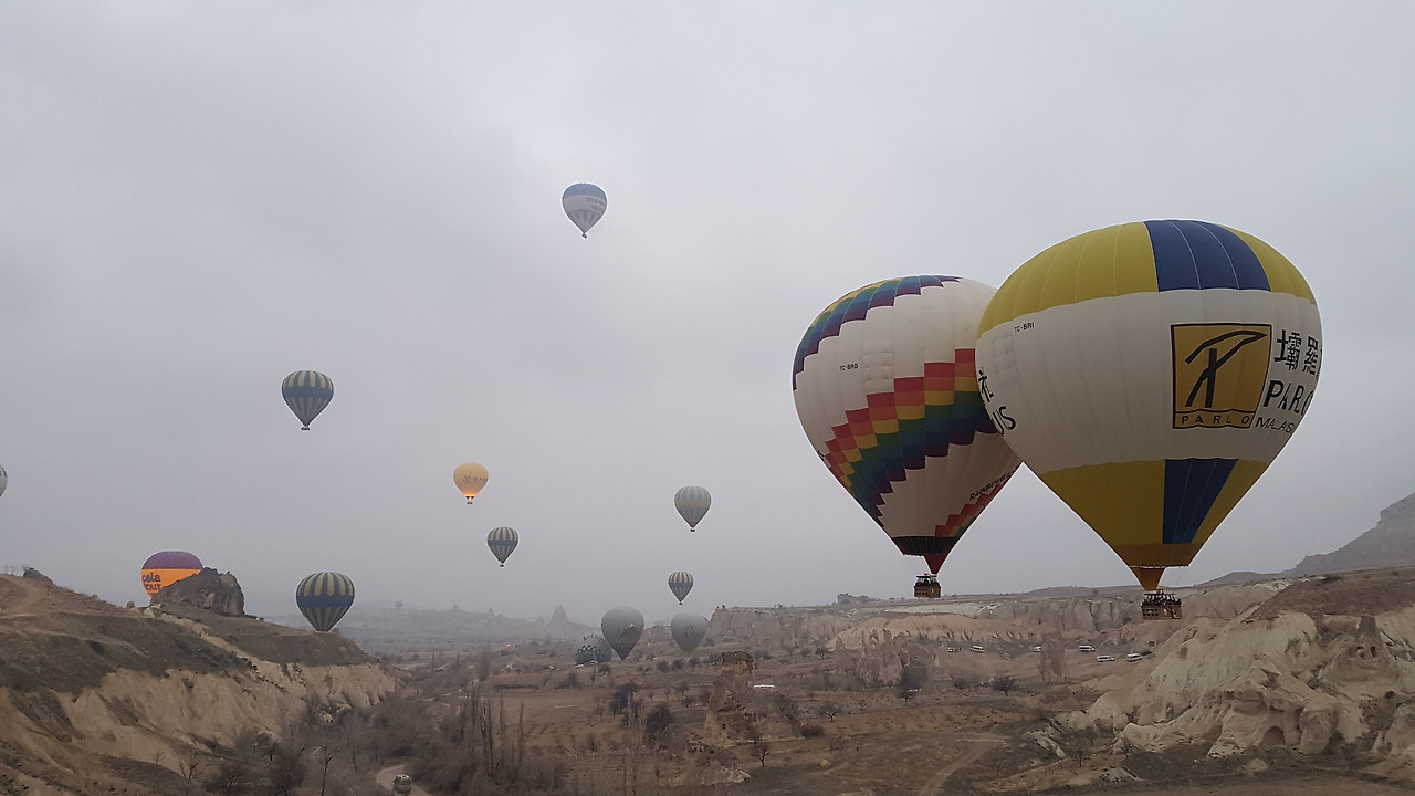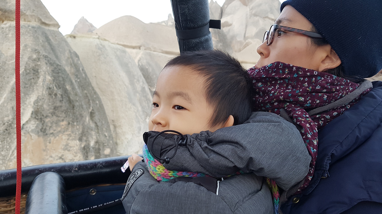비수기라서 사람들이 바글바글할 정도로 붐비지 않아서 여유 있게 열기구에 탑승했다. 엄청난 화력을 자랑하는 열기구 속에 오르니 아직은 떠오른 것에 실감이 나질 않았다. 아이도 열기구에 타는 것에 어리둥절할 뿐 아직은 뭔지 잘 모르는 듯했다. 안에는 우리 외에 대여섯 명이 더 탈 수 있는 꽤 큰 열기구였다. 이윽고 점점 떠오르기 시작하더니 순식간에 오르기 시작했다. 주변에는 수많은 벌룬들이 우리와 함께 오르고 있었다. 다들 처음 보는 풍경에 감탄사만 연발했다. 전혀 보지 못했던 기암괴석이 즐비한 이 대지를 이렇게 열기구를 타고 올라 본다는 것은 특별한 경험이었다. 점점 더 오르더니 밑에 있는 자동차들이 까만 점처럼 보이기 시작했다. 날씨가 아주 화창한 편이 아니라서 멀리 보이긴 하나 다소 흐린 아침이었지만 경탄할 만한 경치였다. 구름 한 점 없이 화창한 푸른빛 가득한 날씨에 오르면 아마 감동은 더해지리라 생각되었다. 아이는 키가 작아서 구경을 하려면 올려 보여주었다. 주변 경치보다는 열기구 타는 것에 재미를 느낀 듯했다.