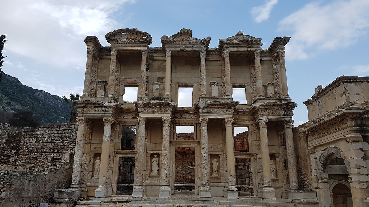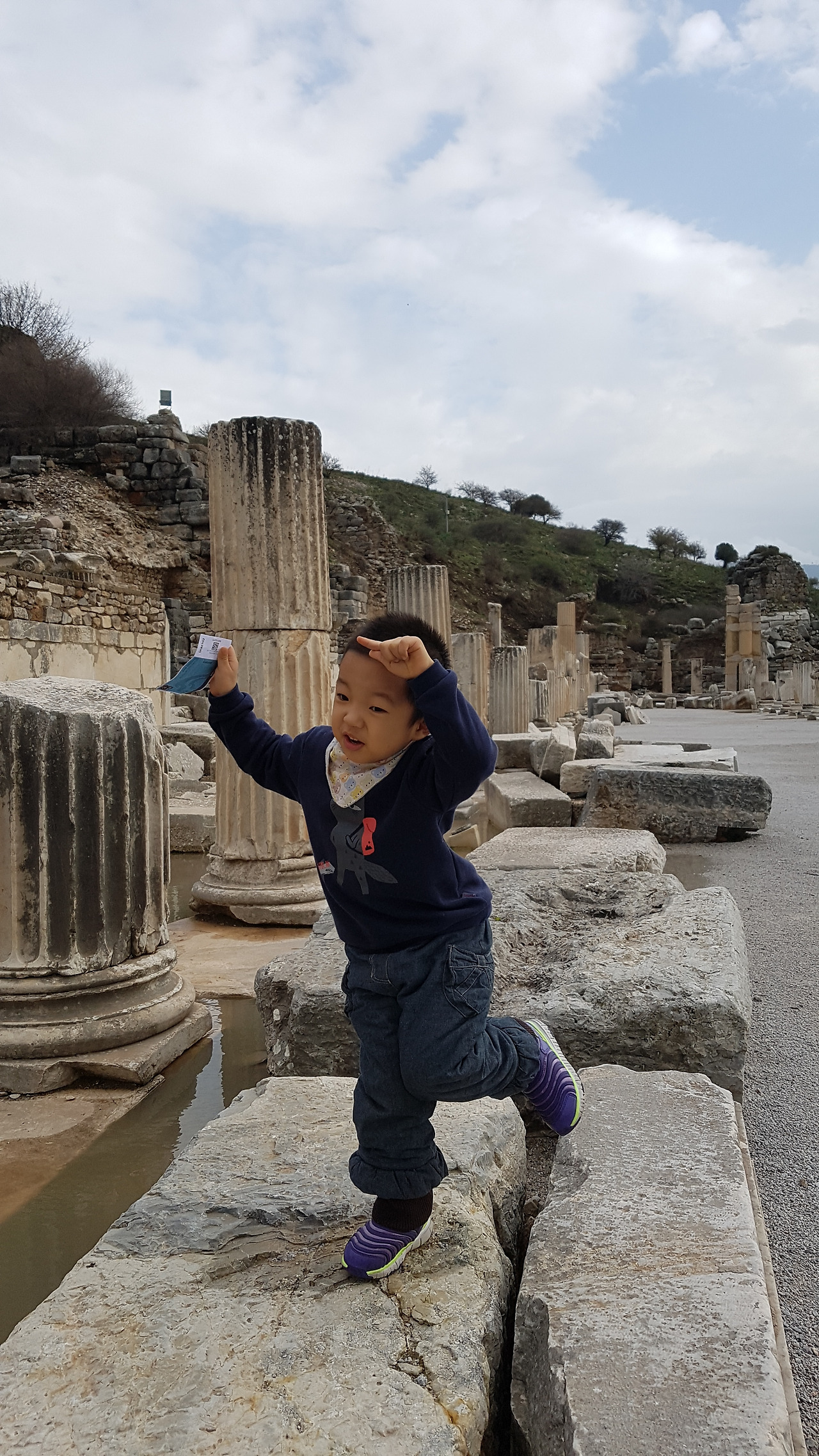 에페소스는 에페소스 공의회로도 알려져 있고 과거 크리스트교를 믿는 사람들이 많이 살던 곳으로 성모 마리아가 마지막 생애를 보낸 곳으로도 알려져 있다. 그래서 근처에 성모 마리아가 묵었다는 집도 있다. 나는 에페소스 도서관으로 기억이 많이 된 도시이다. 이슬람 국가 터키 안에 있지만 고대 크리스트교의 문화재가 굉장히 많이 남아 있는 터키이기에 그중 백미로도 일컬어지는 에페소스는 크리스트교 신앙을 가진 사람들뿐만 아니라 고대 로마 도시를 볼 수 있는 기회이기에 많은 사람들이 찾아오는 곳이다. 입구에 들어가면서부터 과거 대리석 건물들의 기둥, 벽 잔해 등이 기다리고 있었다. 기원전 7세기부터 전성기였던 이 도시는 과거 영화를 누렸던 사람들은 이제 이 세상에 없지만 그 흔적은 남아 지금 사람들이 반추하게끔 했다. 도시가 거의 온전하게 남이 있고 지금도 발굴과 복원이 진행 중이라 천천히 둘러보기에 충분한 크기의 고대 도시였다. 그래서 그 거리를 걷다 보면 그때 사람들이 어떻게 살았는지도 상상해볼 수 있다. 원형 극장에서 울려 퍼졌을 희곡과 노래들, 공용 화장실에서 일을 보면서 나누었을 담소, 홍등가에 가기 위해 발 크기를 재던 모습, 음악회나 시낭송이 열렸을 소극장, 황제에게 바쳐진 거대한 신전, 거대한 목욕탕 그리고 이곳을 오고 갔을 사람들 등 여러 유적들이 즐비한데 그중 내 눈을 끌었던 것은 역시 거대한 켈수스 도서관이었다. 지금도 앞모습이 잘 보존된 도서관은 그 크기를 보았을 때 지식과 규모가 컸던 도시를 가늠한다. 켈수스 도서관은 에페소스 유적의 하이라이트로 이 앞에서 항상 사람들은 사진을 찍는다. 아시아 총독이던 켈수스를 기념하여 지어진 건물은 화려한 코린트식 열주로 세밀한 묘사를 뽐내고 아테네 여신의 석상이 지키고 있었다. 거리를 지나오면 거대한 아고라와 야외극장에서 또 한 번 고대 도시의 웅장한 여유를 눈에 담게 된다. 날씨도 포근해서 천천히 산책하듯 둘러봤는데 아이도 여기저기 뛰어다니면서 잘 다녔다. 2시간 정도 걷자 끝이 보였다.