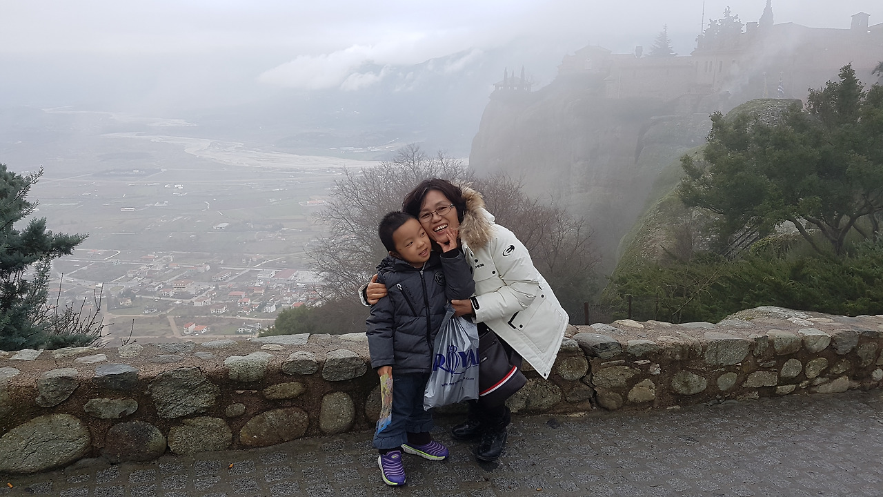 칼람바카라는 지명은 생소하지만 세계적인 명성을 가지고 있는 메테오라가 있는 곳이다. 먼저 예약했던 작은 호텔에 도착해 짐을 푼 후 점심을 먹기로 했다. 주인 할머니께서 굉장히 친절하게 맞아주셔서 마음이 편해졌다. 호텔 방으로 올라가는데 엘리베이터가 고전 영화에서 나오는 문을 여기 전에 철제문을 열고 닫고 하는 구조가 신기했다. 그분에게 식당 추천을 받아서 2차선 도로가 도심의 전부일 것 같은 작은 읍내로 나가 레스토랑을 찾아 들어갔다. 빵, 고기, 토마토, 치즈 등으로 이루어진 소박하면서 정갈한 그리스 음식을 맛볼 수 있어서 다들 원기 회복하고 나왔다. 그때 시간이 이미 오후 3시를 넘었기에 그 이후까지 개방을 하는 유일한 곳인 성 스테파노 수녀원에 갔다. 가기 위해서 택시를 이용했다. 비가 온 후 안개가 짙게 껴서 그런지 주변 풍경은 잘 보이지 않았다. 아내는 우리 가족 중 영어에 가장 능통했기에 택시 기사님에게 나의 질문을 받아 통역하는 역할을 했다. 그런 아내를 보고 아이는 이야기하지 못하게 아내 입을 계속 손으로 막는 시늉을 했다.