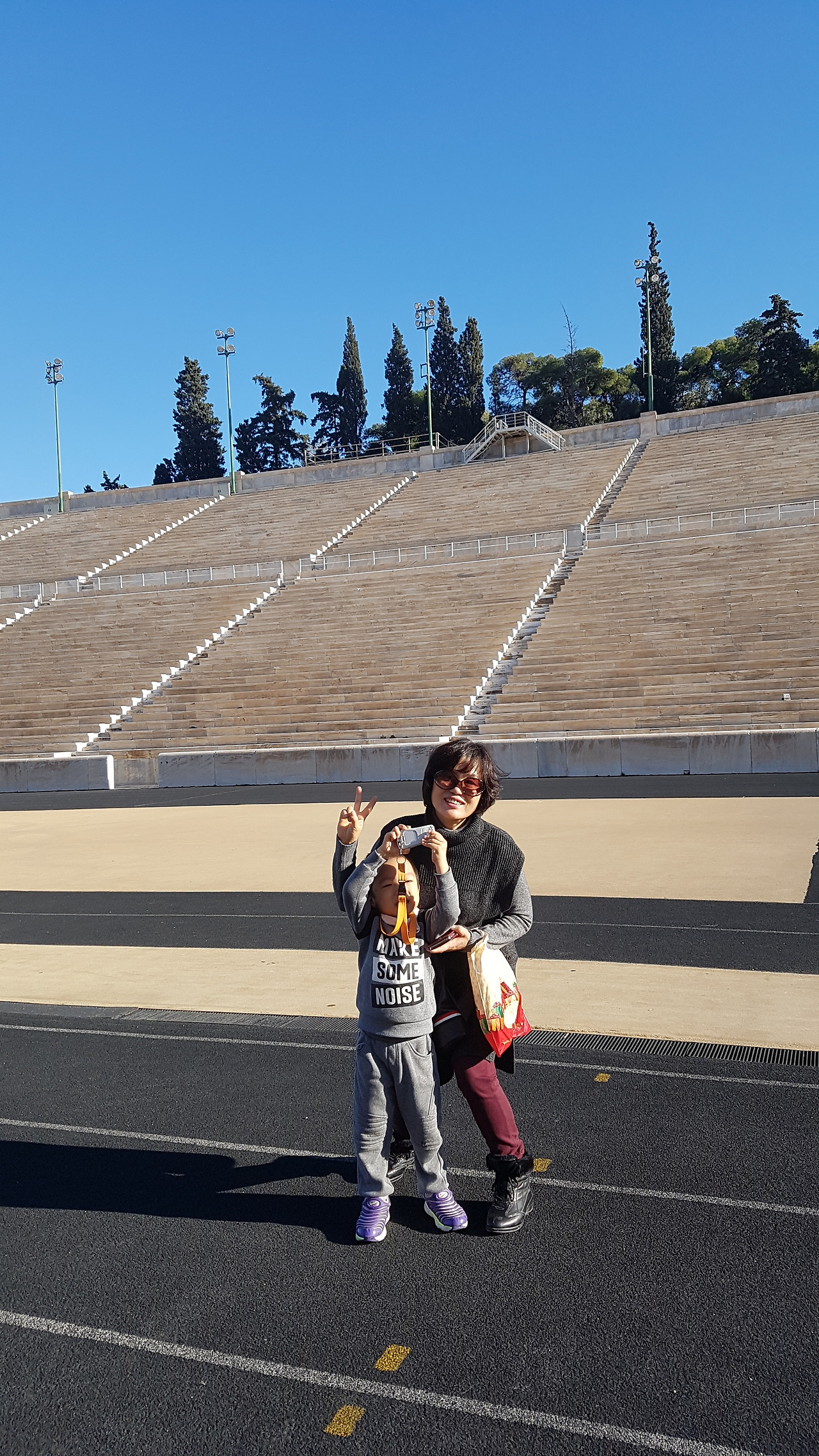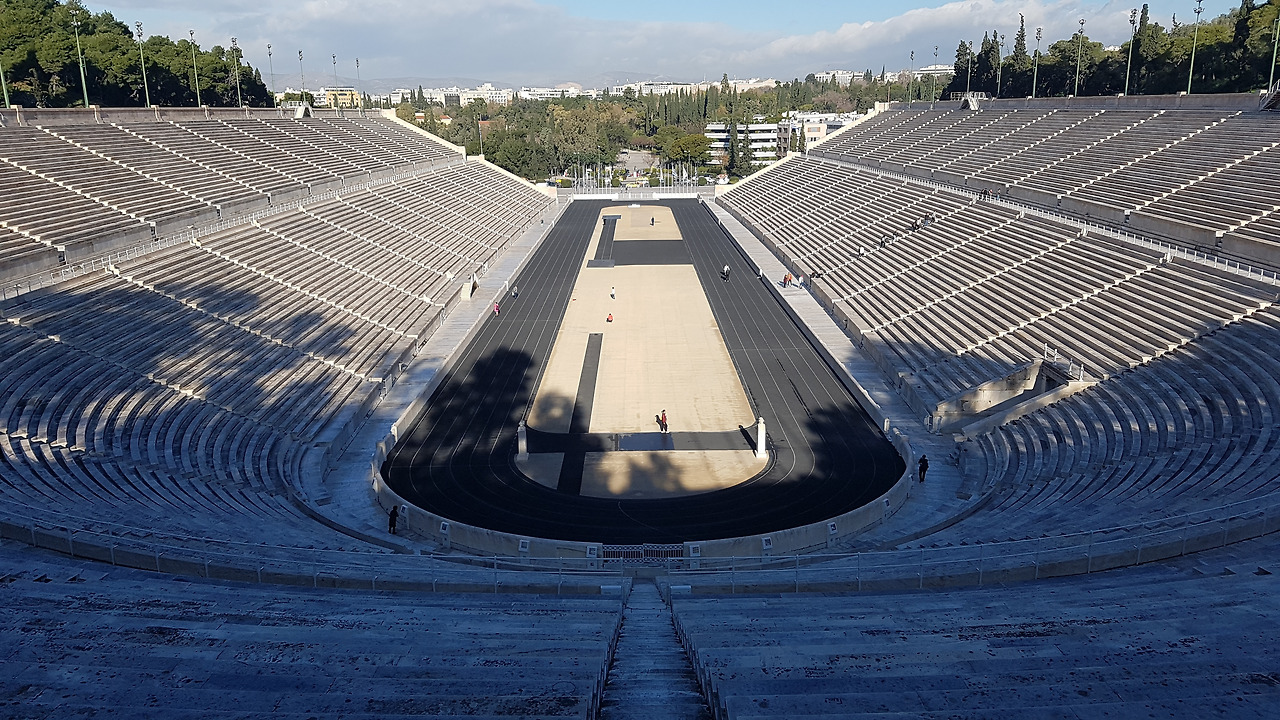 느긋하게 아테네 시내를 걷는 날이라 다들 급하지 않게 아침에 눈을 뜨고 준비했다. 여전히 아침은 과일과 요거트, 빵, 삶은 달걀이었다. 숙소에 드립으로 커피 내리는 것도 있어서 커피도 한 잔씩 했다. 호텔이 아닌 이런 집에서 숙박을 하다 보니 일정도 자유롭고 음식도 만들어 먹을 수 있어서 편한 것이 있었다. 물론 침대 시트나 수건 교환이 되지 않는 등의 불편함은 있었다. 아테네는 말 그대로 구름 한 점 없는 화창한 날씨여서 패딩은 벗고 가기로 했다. 그러고 보니 아테네에서는 초가을 날씨처럼 날이 좋아 겨울이라는 것이 전혀 실감 나질 않았다. 첫 번째로 방문할 곳은 올림픽 경기장이었다. 고대 파나티나이코 경기장이 있던 자리에 만들어진 제1회 올림픽 경기장은 눈부신 대리석으로 빛을 발하고 있었다. 세계에서 유일하게 전부 대리석으로 만들어진 주경기장이라고 한다. 8만 명을 수용할 수 있다고 전해지는데 고대 그리스의 양식을 따르면서 멋지게 지어진 경기장이었다. 최근에도 사용되며 우리에게는 2004년 아테네 올림픽 당시 양궁 경기 장소로도 알려져 있다.