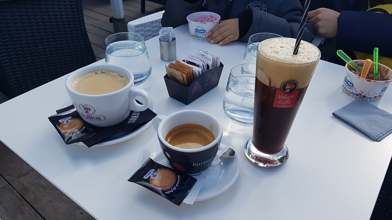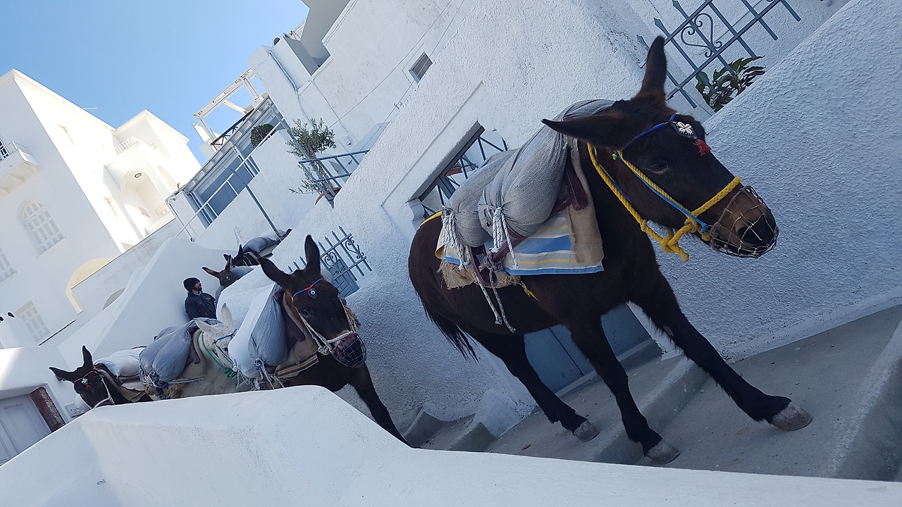 피라마을 중심가 카페에 들어가 어른들은 커피, 아이는 아이스크림을 주문했다. 아이는 본인이 직접 주문하려고 아이스크림을 계속 외쳤다. 나는 어제 아이를 안고 피라마을 끝까지 걸어간 것 때문에 손이 붓고 머리가 조금 아팠다. 더블 에스프레소로 정신을 조금 차리고 기념 셀카를 찍었는데 사진을 본 아내는 피곤의 끝에 찍은 셀카도 아기 피부로 나오는 산토리니의 하늘에 감탄했다. 피라마을에서 버스를 타고 산토리니 공항으로 갔다. 들어올 땐 몰랐는데 공항도 하얀색에 파란색이 포인트로 페인트가 칠해져 있어 산토리니 공항다웠다. 밤이 되어 다시 아테네로 돌아왔는데 어디 둘러볼 시간은 안되어 아테네 공항 근처에 집을 하나 빌려서 잤다. 그리고 우릴 오늘, 내일 이동을 책임져줄 기사님을 만났는데 그분에게 여쭈어 보아 저녁식사를 할 식당을 추천받았다.