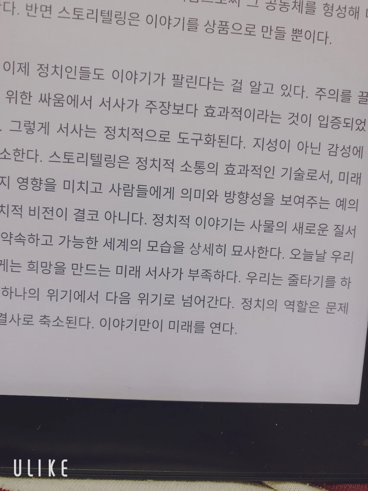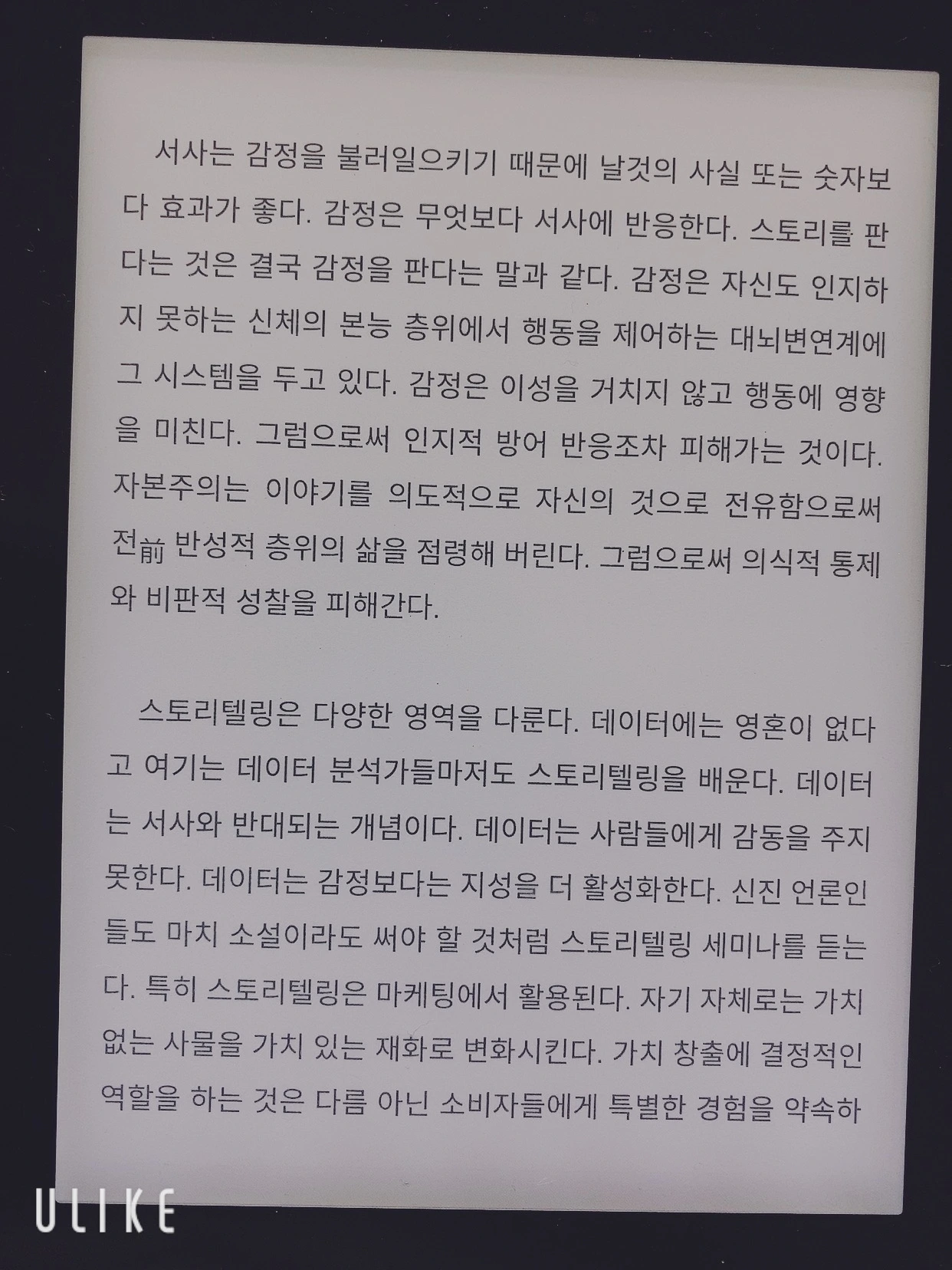 혹자는 너무 자본주의에 모든 책임을 전가하는 거 아니냐고 묻겠지만, 사실인 것을? 제대로 된 이야기는 노예들에게 사유할 힘을 주고, 사유하는 힘이 생긴 노예를 효율적으로 착취하기란 힘들다. 자본주의 권력의 질서에서 지배계층은 착취하기 좋은 노예, 생각하고 사유하지 않는 노예를 원한다. 이야기를 통해 생각할 힘을 얻는 노예가 아닌, 그저 주어진 이야기를 소비하기만 하는 노예를 원한다. 한교수님이 현대사회 권력의 질서에 대해 한번쯤은 정리 요약을 해주셨으면 하는 바람인데 아직은 안 나오고 있다.
