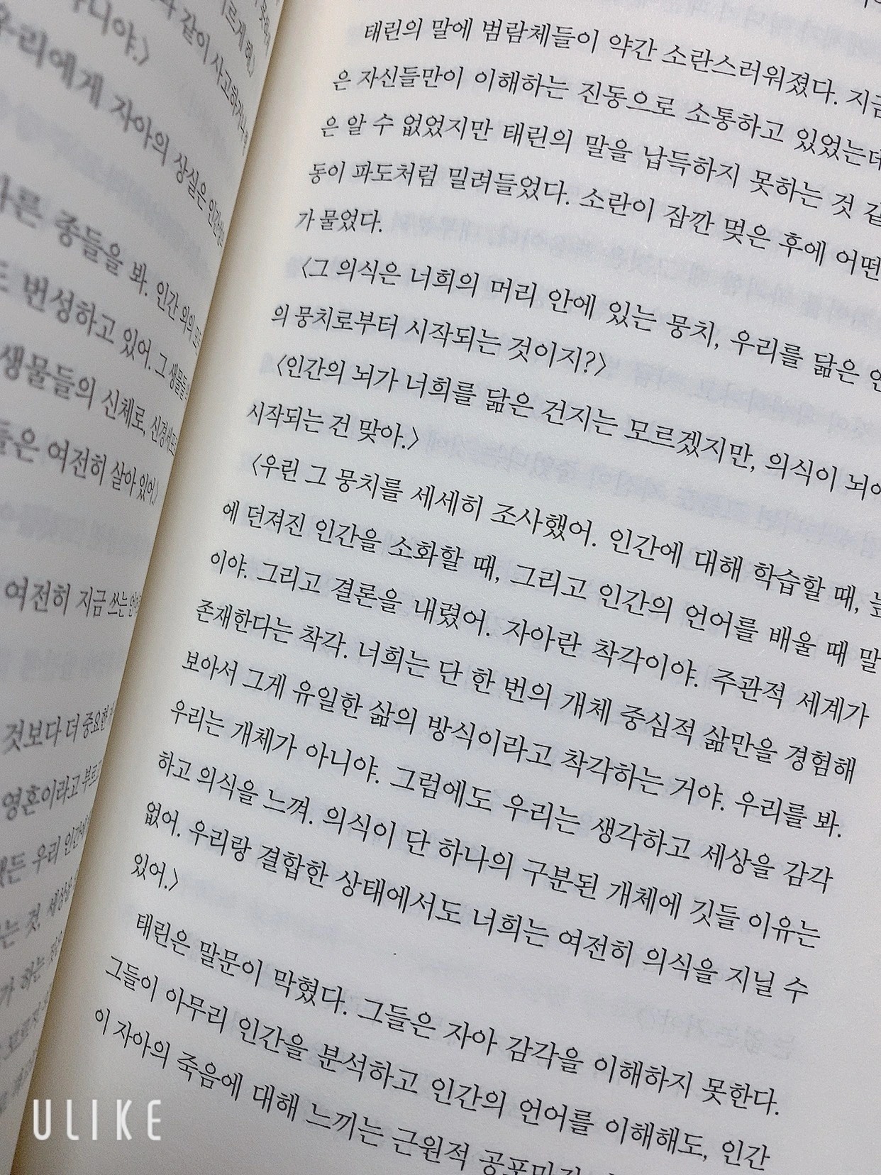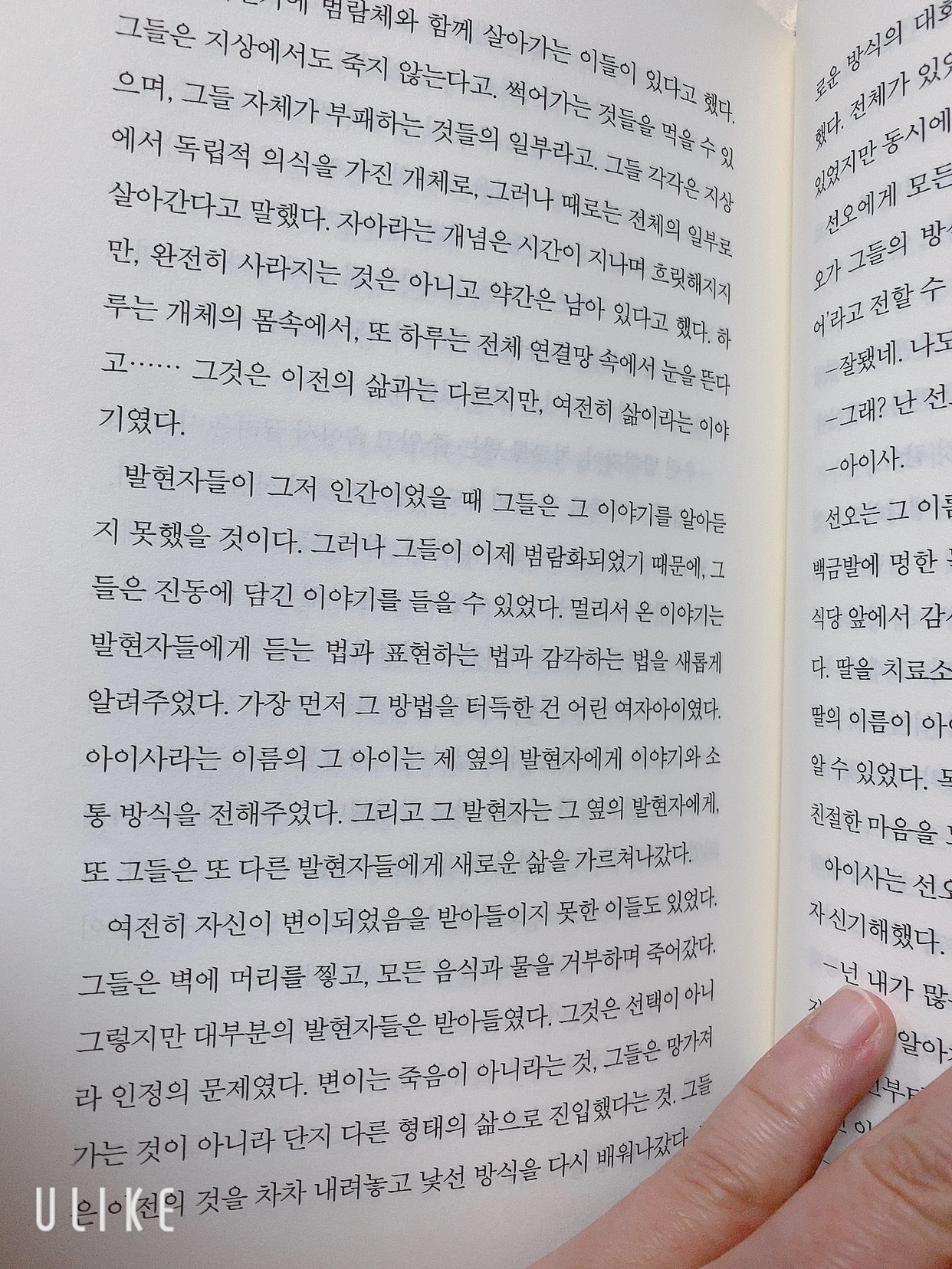 내가 난해하다고 했던 개념은 한몸에 두 자아 개념이 아니고 범람체의 특성에 관한 개념이었는데..... 개체의 군집으로 존재하는 전체, 개체가 갖는 고유성을 부분적으로 인정하는 전체로서의 의식..... 이게 참 난해했는데..... 그게 조화롭게 공존하는 시스템이 계속되면야 좋지만 어느 날, 만약 결국 그 고유한 개별 자아 중 하나가 전체로서의 의식에 대항하기 시작하면? 전체가 그 자아 하나에 복종할 건가? 아니면 대를 위해 소를 희생할 건가? 여기서 전제는 “개별 자아를 조금만 인정한다”인데 그 조금이 얼마만큼일 것인가, 일단 이것도 난해하지만 결국 섬찟한 것은 모든 자가 자신에게 흡수되어 동화되기를 강요하는(그게 본능이니 어쩔 수 없다는 핑계로) 전체적 의식. 결국은 이게 전체주의의 핵심 아닌가. 너의 자아를 흐리게 만들어 우리에게 흡수되도록 하라. 뭐 소설에서야 늪인, 이라는 또다른 종족을 구현해서 절충안을 제시했다지만...... 개인적으로는 범람체라는 존재의 특성이 무섭게 다가온다. 세상에는 소통과 교류를 거부하고 혼자이고 싶어하는 자아도 많을 텐데.