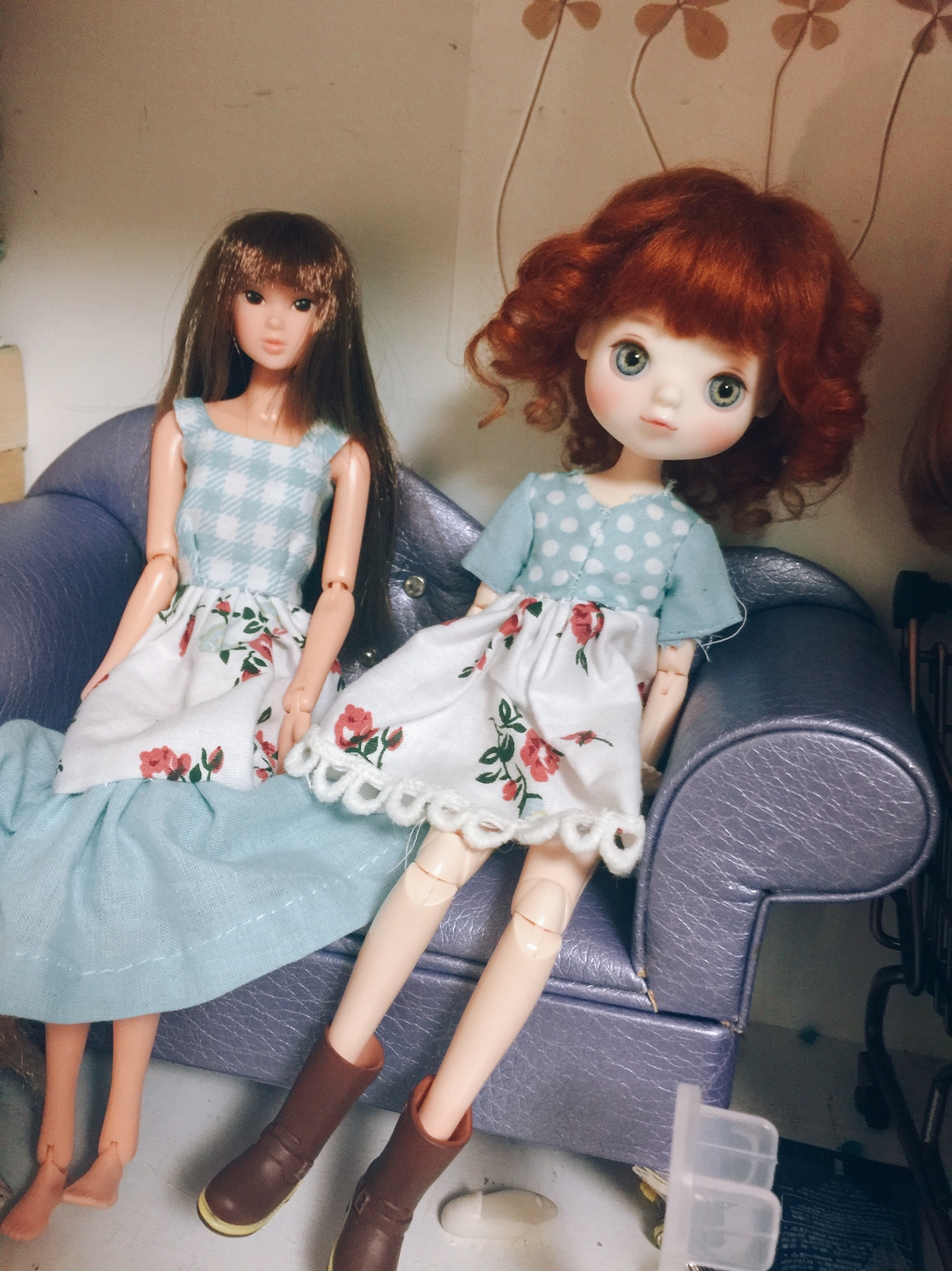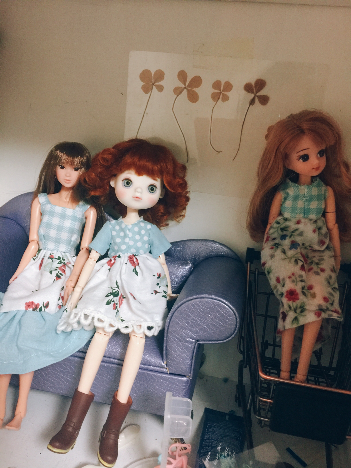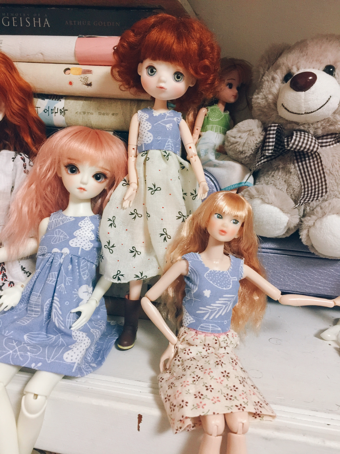 이렇게 깔맞춤 세트를 만드는 이유는 한 장의 원단을 다양하게 응용할 필요가 있어서아기도 하지만, 그렇게 만들어진 옷이 일종의 유니폼 내지는 패밀리 룩의 역할을 한다는 데 그 묘미가 있다. 내 경우 똑같은 디자인의 옷을 여러 벌 만드는 것보다는 각 인형의 체형이나 개성에 맞게 조금씩 디자인에 변화를 주는 쪽을 선호한다. 통일감이 두드러지는 그 가운데에서도 각자의 개성과 그 개성의 조화를 중시하기 때문이다.