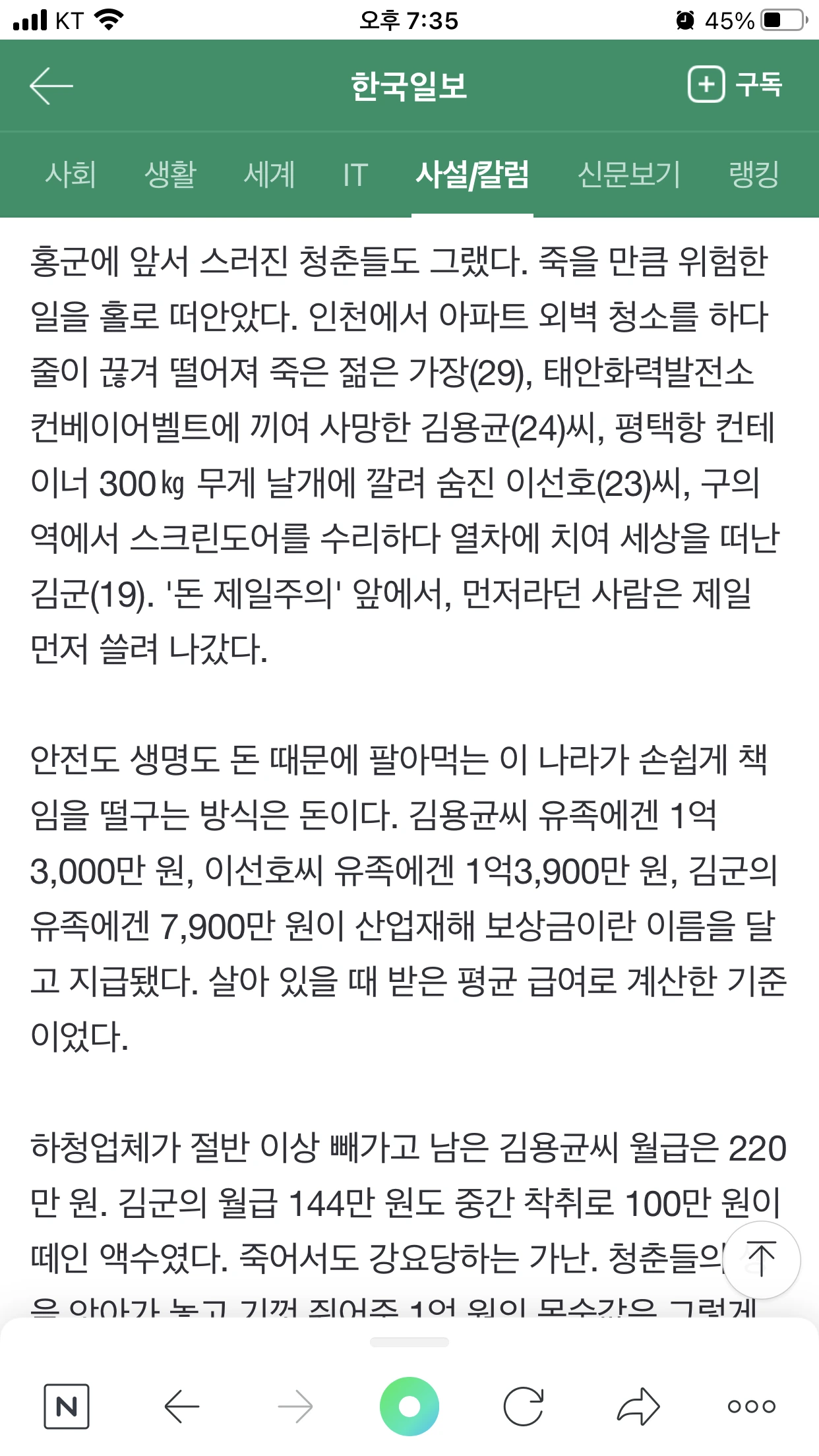 아마도 아니 분명히, 죽은 애들을 대신해 그 일을 도맡아 했어야 할 사람들이 있었을 것이다. 하지만 그들은 알고 있었다. 그 일이 잘못하면 죽을 수 있는 일이라는 걸. 최소한의 안전장치도 해놓지 않을 바엔 차라리 일 못한다고 내쫓았으면 최소한 죽지는 않았을 애들이다.