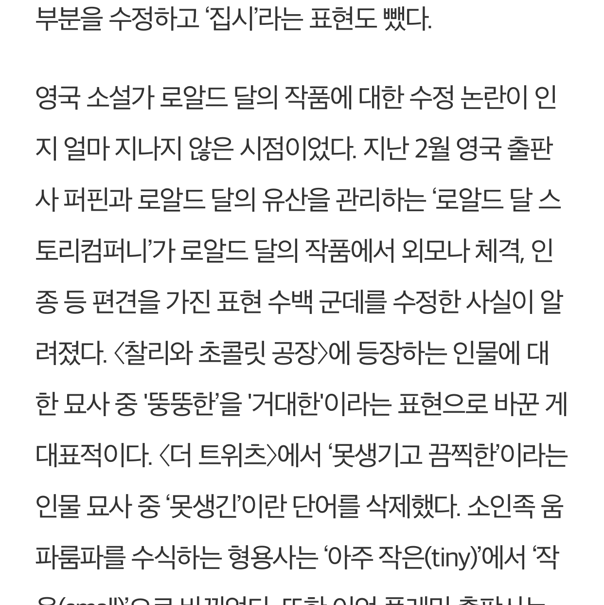 정치적 올바름은 어디까지나 정치적 올바름이다. 정치적 올바름이 현실적 올바름을 구현한다고 착각하면 그거보다 위험한 일이 없다. 인간을 몰라도 한참 몰라서 하는 소리다. 앞에서는 차별 철폐와 평등을 외치지만 고급 일자리를 유색인종에게 양보하라면 눈도 깜짝 안할 것들이. 앞에서는 우리 다 평등하다면서 자기들끼리 편 가르고 계급 만들고 우러르고 까내리는 게 인종을 초월한 인간 공통의 특징인데 이제는 하다하다 안 되니 문화유산에까지 손을 대나? 아니면 로알드 달이 그렇게 막 손을 대도 될 만큼 문화유산적인 가치가 없나?