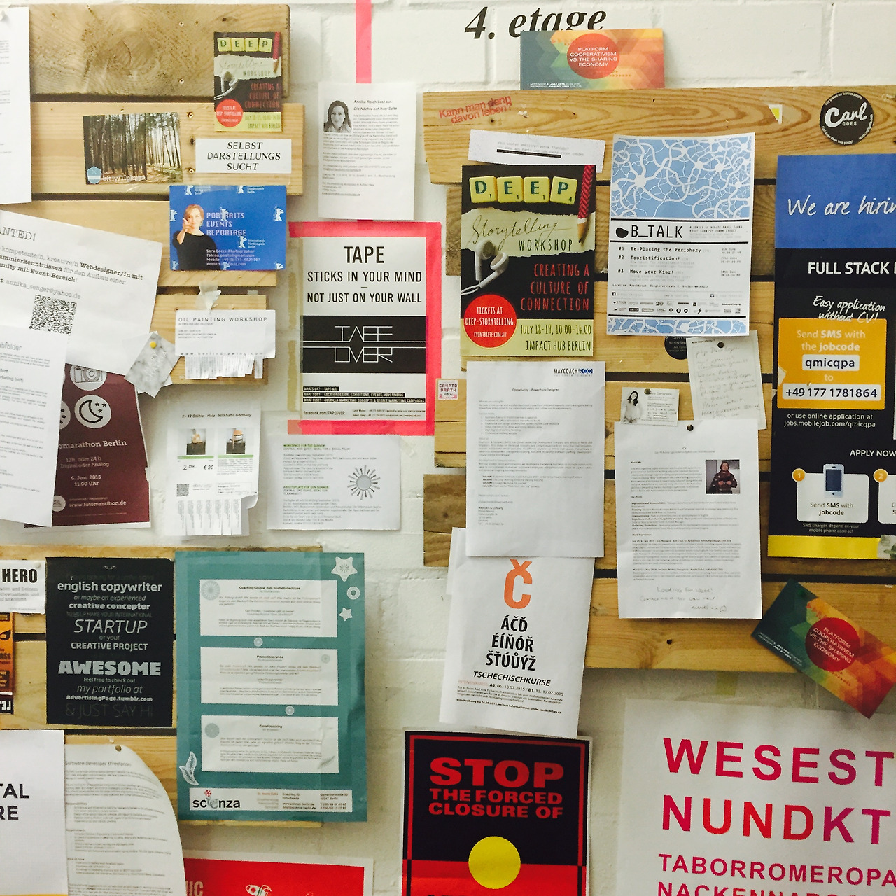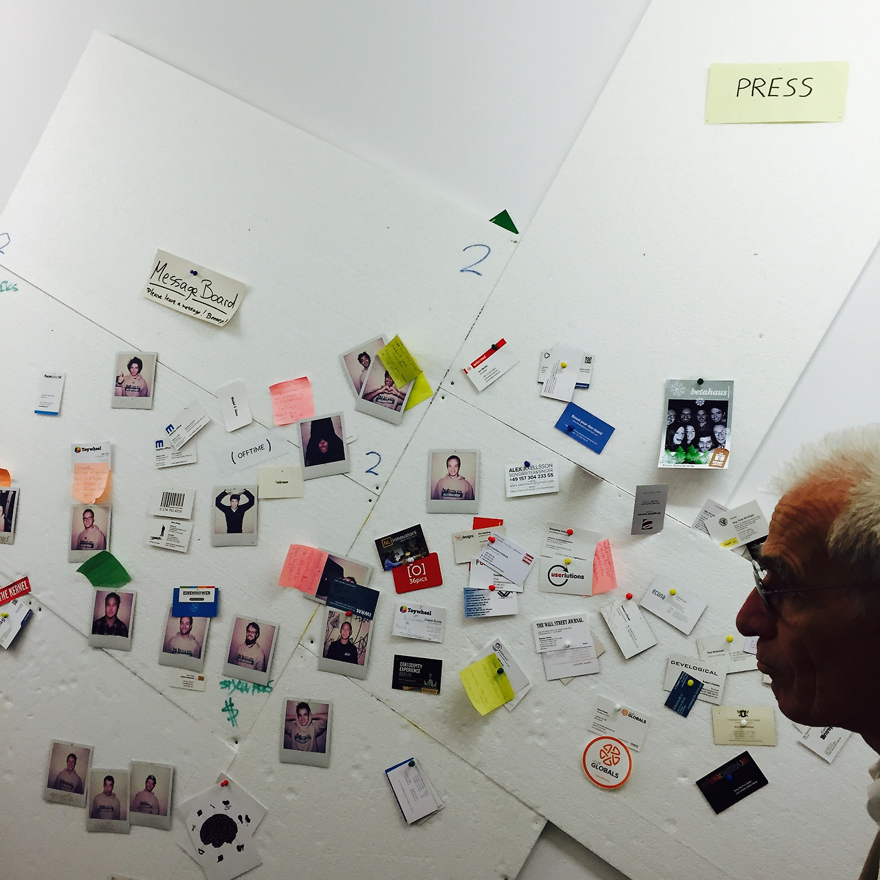 betabreakfast에 참가하면 사무실도 구경할 수 있다. betahaus직원이 가이드를 해주는데, 아이폰 찰칵 소리가 방해될 것 같아 사무실 사진은 찍지 못했다. (한국에선 법적으로 휴대폰 카메라 소리가 나도록 정해져 있단 말에 외국인들은 아주 놀랐다.) 강당 같은 공간에는 폭신한 쇼파가 놓여있었다. 여러명이 앉을 수 있도록 큰 탁자를 놓은 회의실이 있다. 한쪽 벽면을 차지하는 화이트보드도 있었다. 자신을 소개하는 폴라로이드 사진과 구인구직 광고는 예술 작품 같았다.