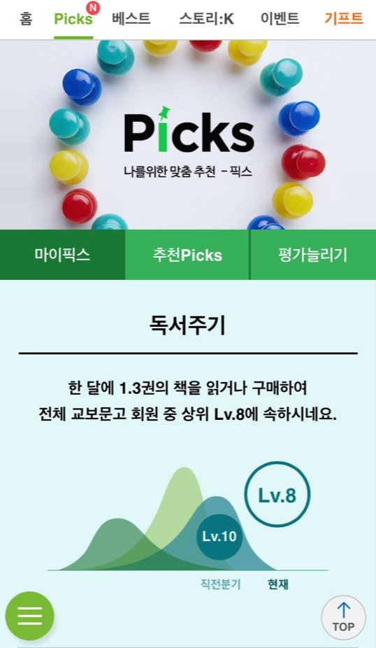 책은 주로 인터넷교보문고나 바로드림으로 사기 때문에 교보문고 앱만 보면 내 책 사는 습관을 분석할 수 있다. 요즘 나는 한달에 1.3권 정도 책을 산다고 한다. 레벨 1~10 중 8에 속한다고한다. 직전 분기에는 레벨 10이었는데!!