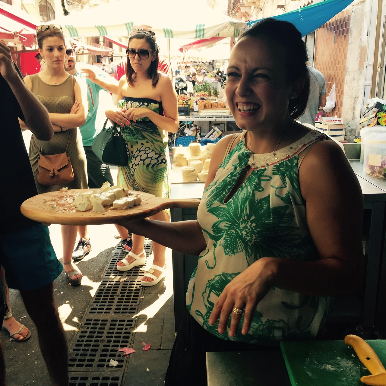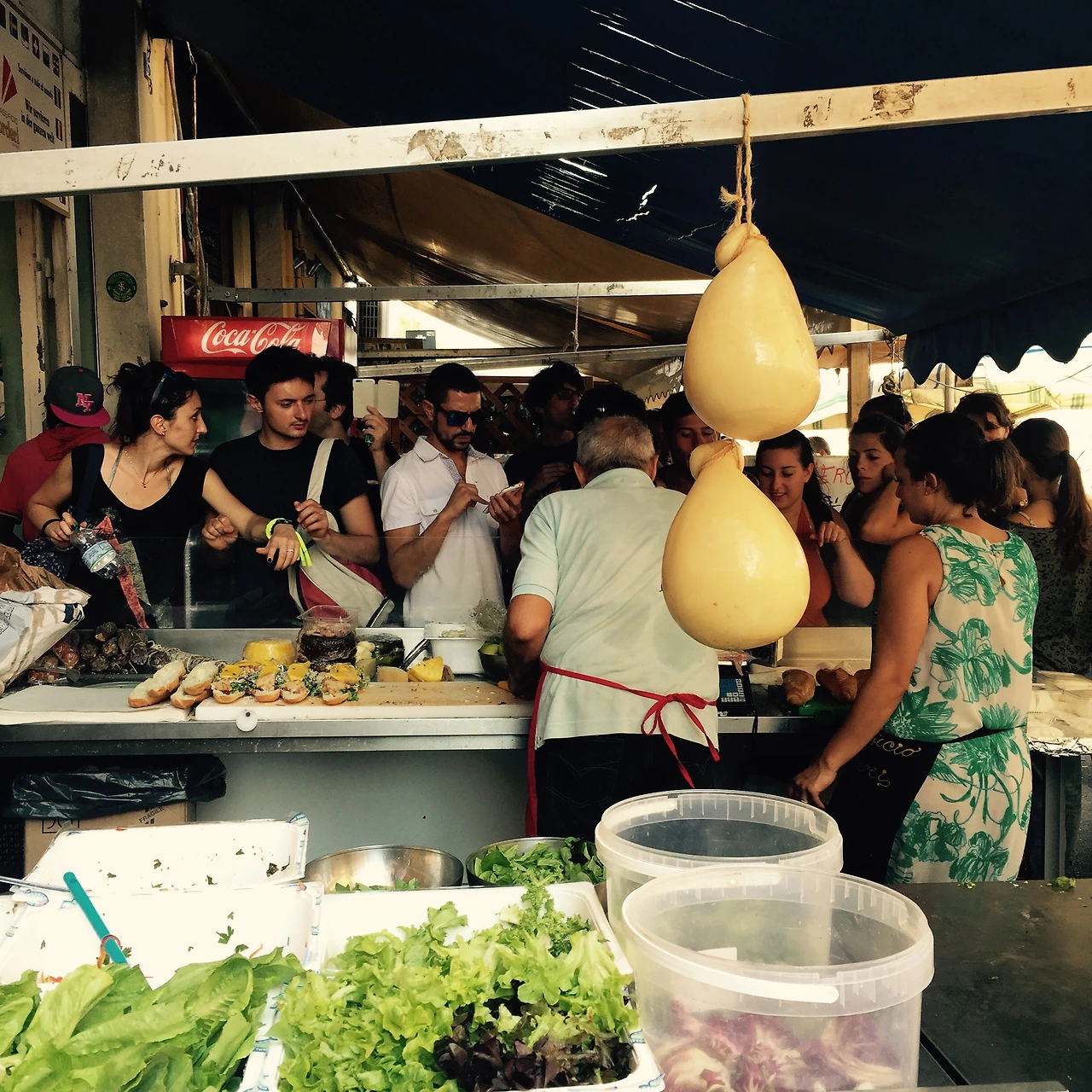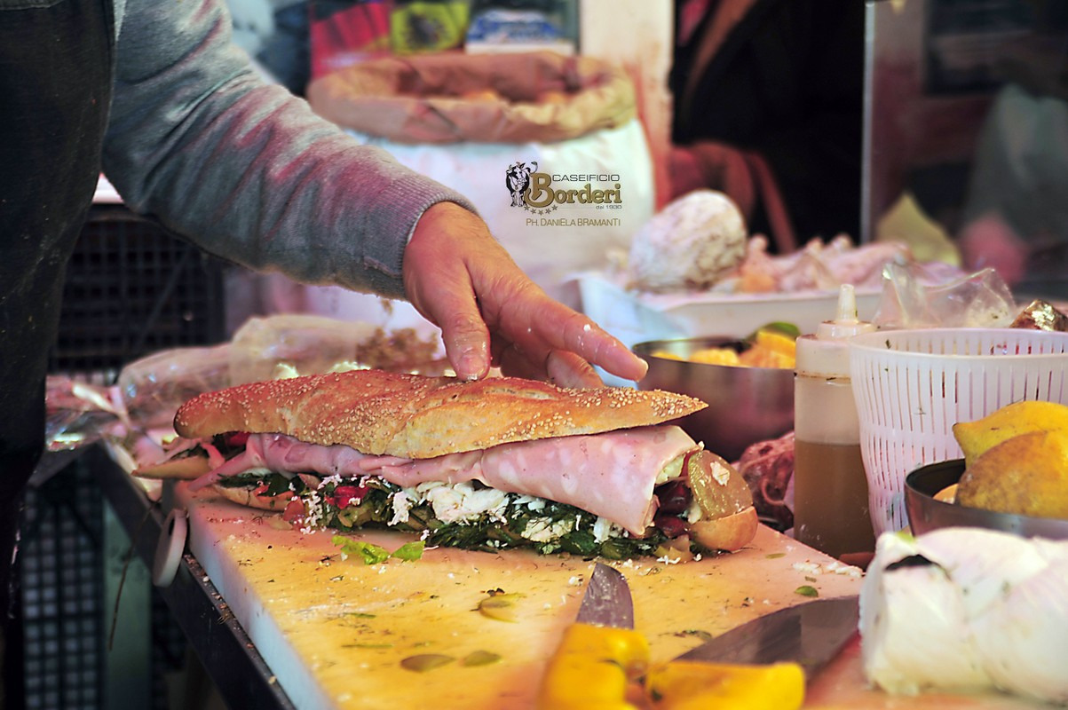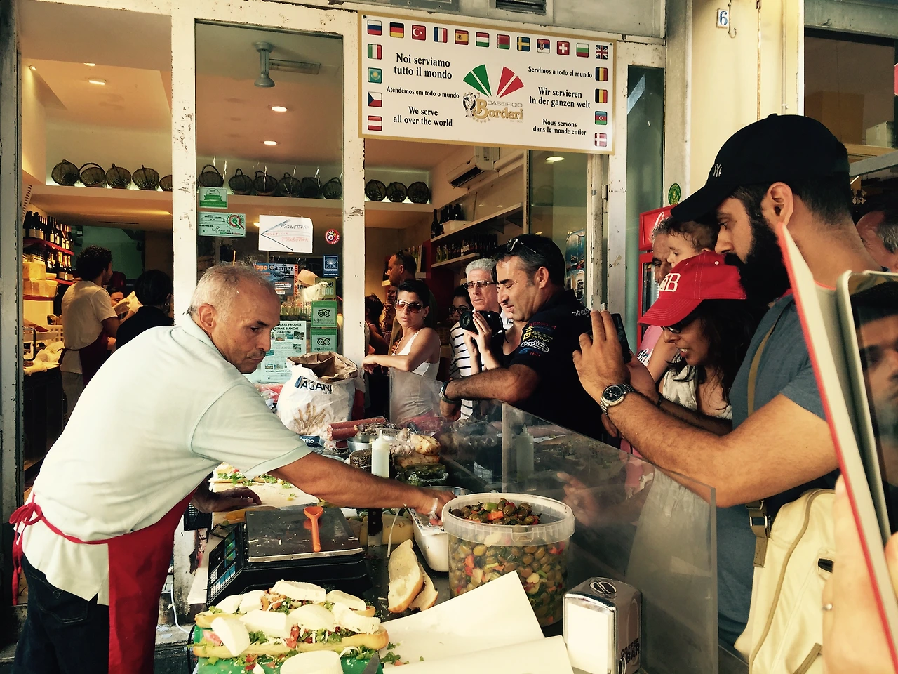 내가 가장 좋아하는 사진. 시칠리아 전통 치즈인 조롱박 모양 '까쵸까발로(Caciocavallo·이탈리아어를 풀면 말의 안장을 걸쳐놓은 모습이라고 한다)'가 걸려 있고, 줄 서 있는 사람들은 행복하고, 보데리 가족이 분주하게 일하는 모습이 한 컷에 담겼기 때문이다. 노란 치즈가 잔뜩 올라간 샌드위치와 신선한 채소도 잘 보인다.