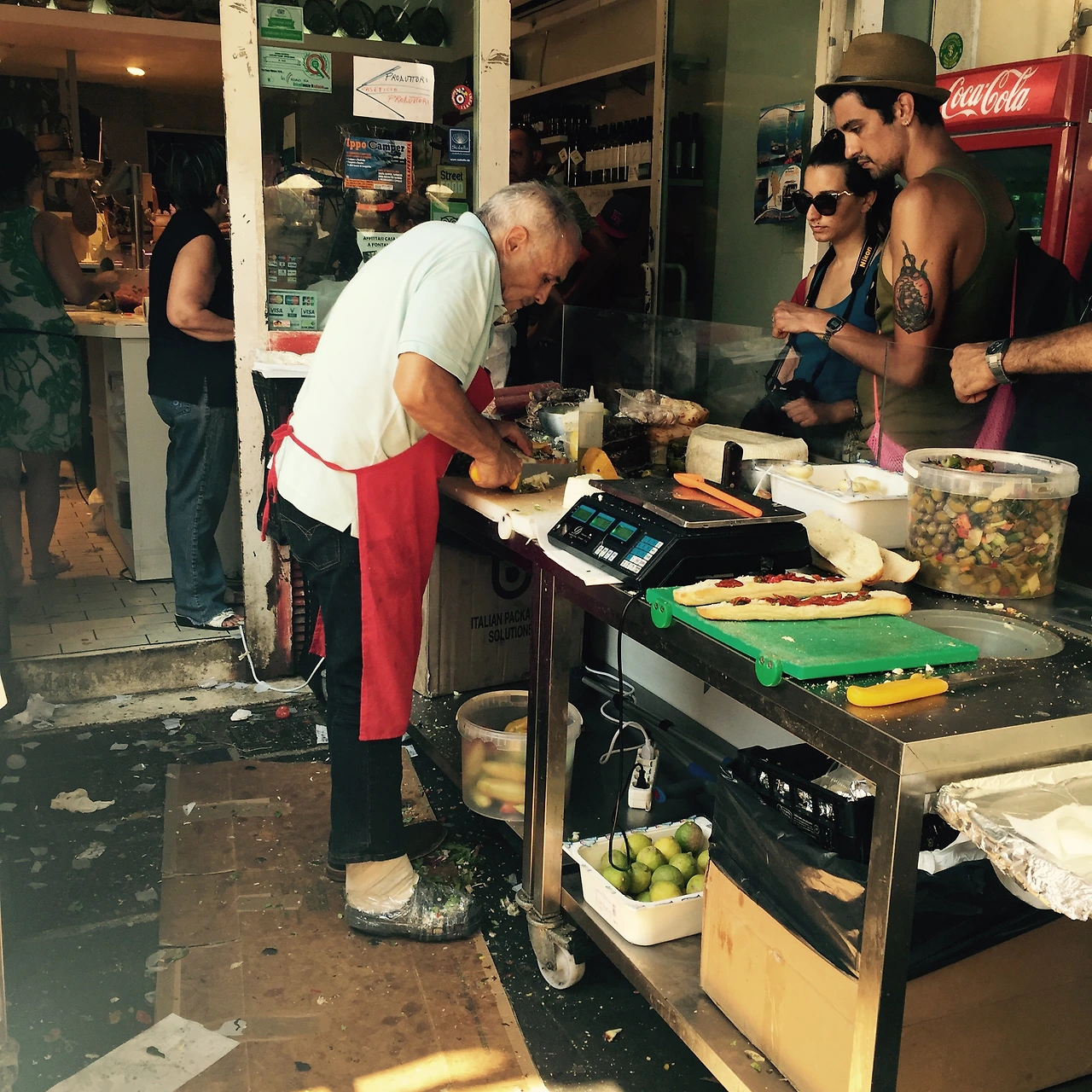 일단 궁금하면 아래 영상을 보자! 무려 8분 46초 동안 샌드위치 하나를 만든다. 물론 빵을 여러 개 펼쳐서 동시에 만들 때도 있다. 빵에 속을 채우다 말고 갑자기 치즈를 자르더니 기다리는 사람들에게 나눠준다. 줄 서 있는 손님들과 끊임없이 대화한다. 지나가던 이웃들과도 수다를 떤다. 줄 서서 기다리던 관광객과는 사진을 찍기도 한다.