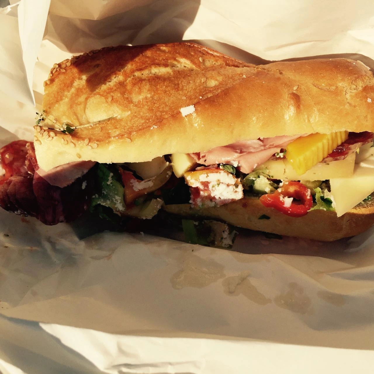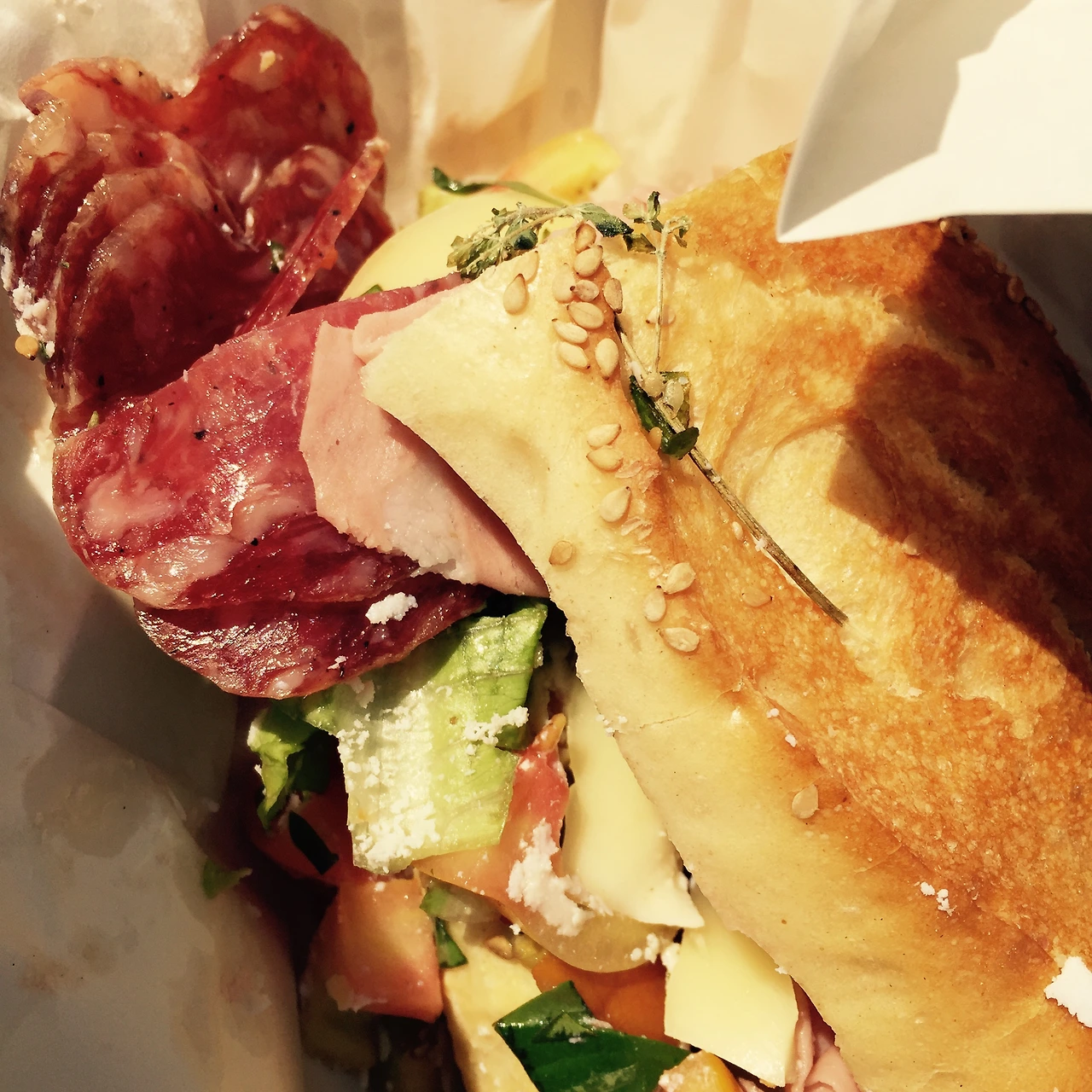 그렇게 말린 토마토, 생 토마토, 각종 채소, 치즈 3~4종류, 햄 2~3종류를 차곡 차곡 쌓고 나면 거대한 샌드위치가 완성된다. 틈틈이 뿌린 올리브오일과 레몬즙은 이탈리아 (그리고 시칠리아)의 상징 같다. 30cm쯤 되는 바게뜨는 빵 속을 파내고도 높이가 5~6cm가 넘는다.