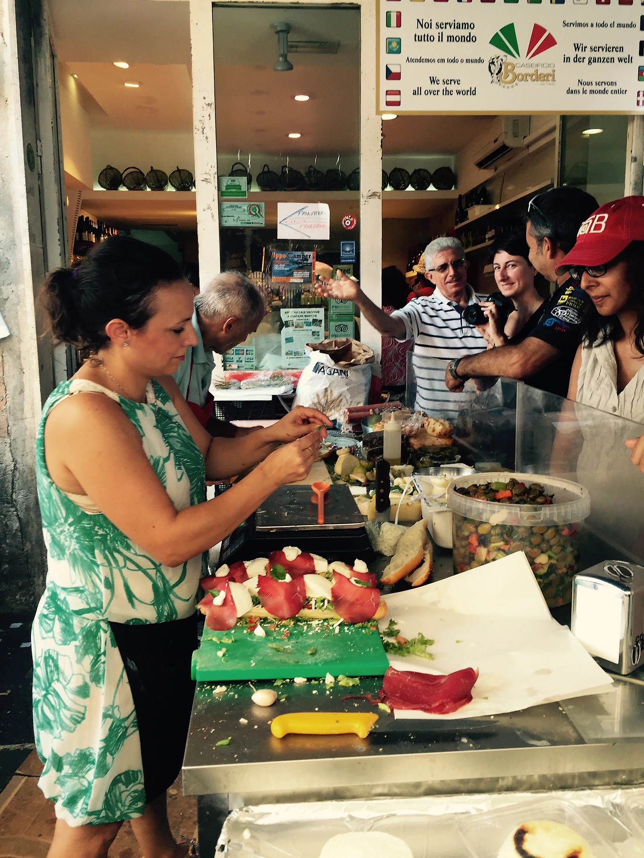 왼쪽 하얀색 반팔 티셔츠를 입은 사람이 바로 안드레아 보데리. 사진에는 무뚝뚝하게 나왔지만 그렇게 유쾌할 수가 없다. 줄 서 있는 모든 고객에게 말을 걸고 맛있는 치즈를 권한다. 1998년에 치즈 만드는 장인이 됐다고 한다. 지금은 아들, 며느리와 함께 가게를 운영한다. 가게에서 파는 모든 치즈는 전통적인 방법을 사용해 직접 만든다고 한다. 갓 만든 따끈한 (순두부 같은) 치즈를 공짜로 줘서 먹어봤는데 진~~~~~~~~~~짜 맛있다.