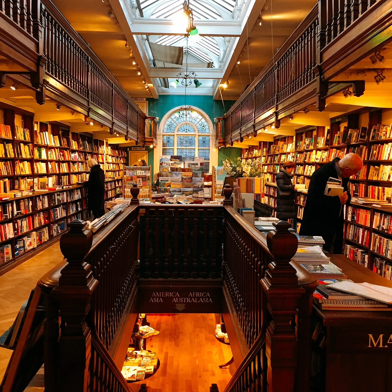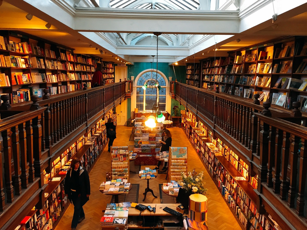 서점 중앙에는 길게 쭉 뻗은 공간이 있고, 끝에는 아치형 스테인드글라스 창문이 있다. 들어가는 순간 압도된다. 2층에는 나무 난간이 있다. 이 공간은 나무 특유의 삐그덕 소리가 나서 오래된 도서관을 탐험하는 느낌을 준다.