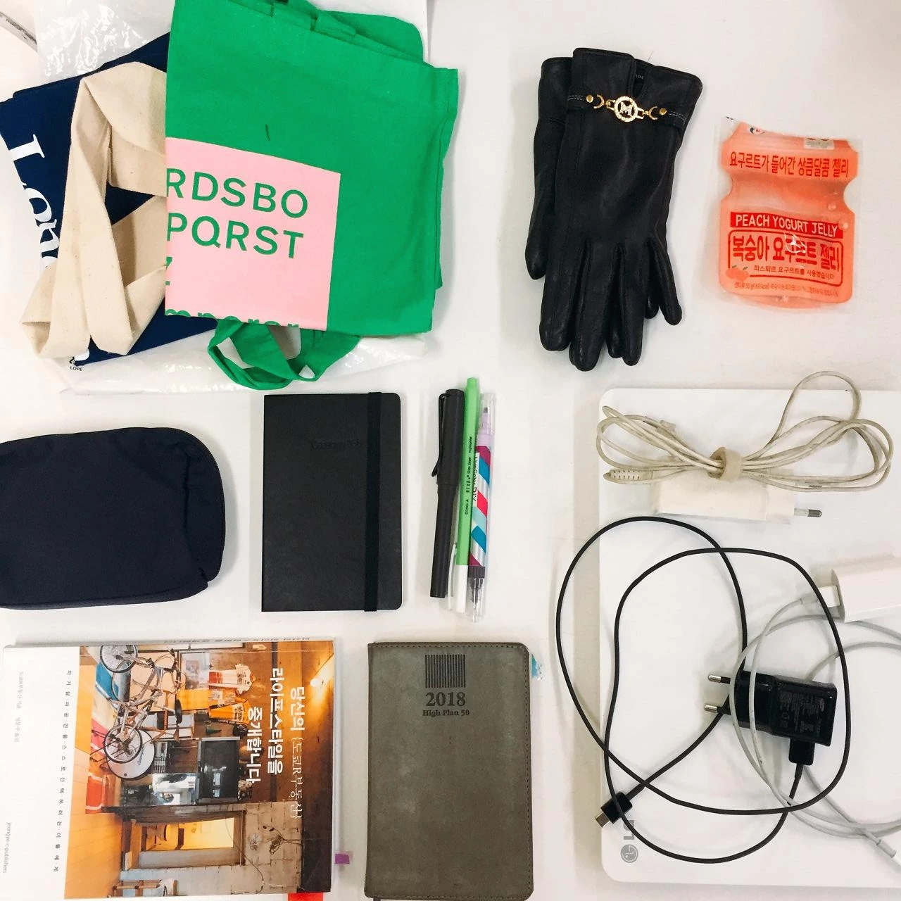 물건이 많은 날이었다. ① 13인치 노트북+어답터 ② 책 1권 ③ 도톰한 다이어리 1권 ④ 얇은 수첩 1권 ⑤ 펜 3개 ⑥ 화장품 파우치 ⑦ 지인에게 줄 에코백 2개 ⑧ 장갑 ⑨ 젤리 1개 ⑩ 휴대폰 충전기 2개