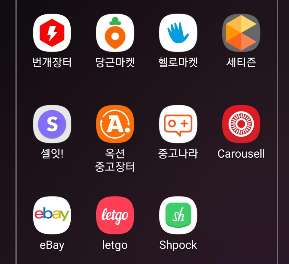 -번개장터: 모바일 중고거래 앱 중 사용자가 가장 많은 만큼 물건도 많다. 중고나라의 모바일 버전이라고 생각하면 된다. 편의점 택배가 연계돼 있어 택배 거래를 하기 좋다. 사용자가 많아 기본적으로 물건이 많다. 10~20대 이용자가 많아 아이돌 관련 굿즈, 콘서트 티켓, 피규어, 워크맨 등 일부 전문적인 제품도 많은 편이다.