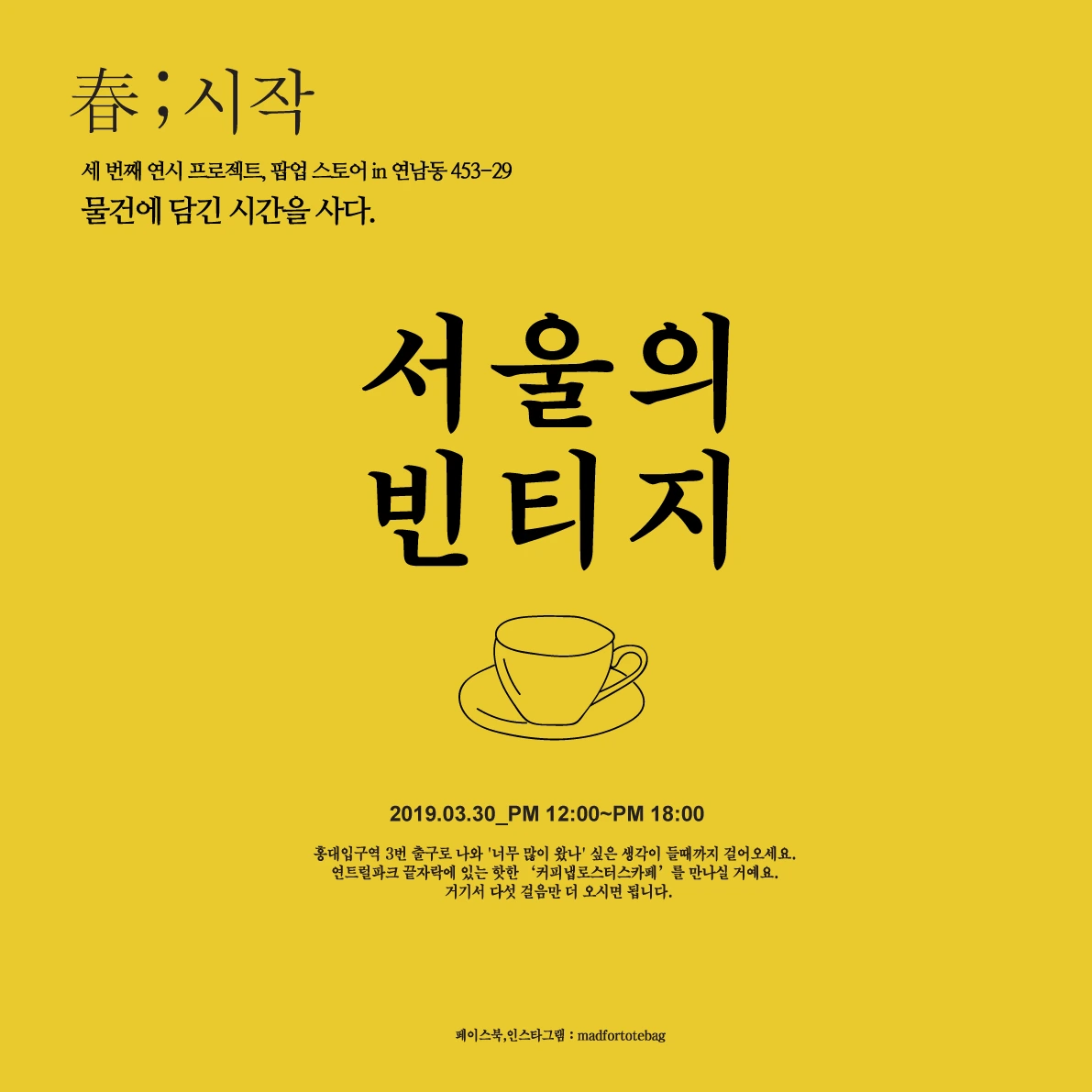 2019년 1월부터 한달에 한 번씩 전시회를 했다. 이름처럼 거창하진 않지만 내가 좋아하는 물건에 이야기를 담았다. 1월은 '런던의 에코백', 2월은 '도쿄의 손수건'이었다. 3월에는 30일 토요일에 '서울의 빈티지'를 하기로 했다.