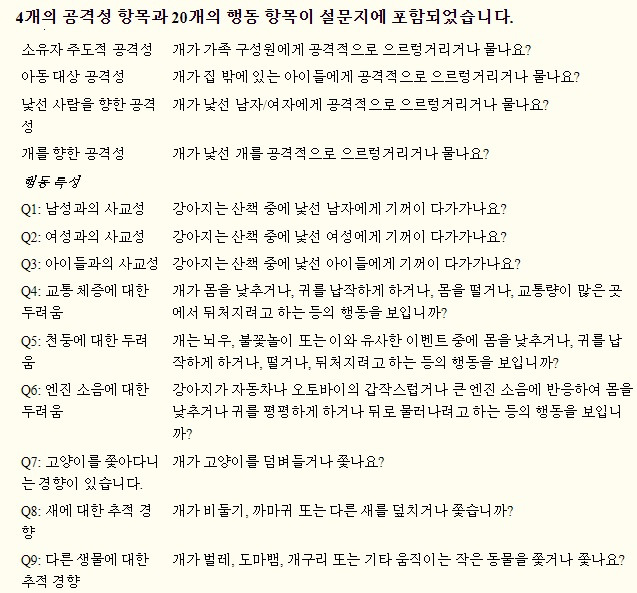 연구진은 각 공격성을 특정하고 (낯선 사람에 대한 공격성, 주인에 대한 공격성, 다른 개에 대한 공격성)20개의 행동항목을 설정하여 설문조사를 실시하여 통계치를 냈습니다.