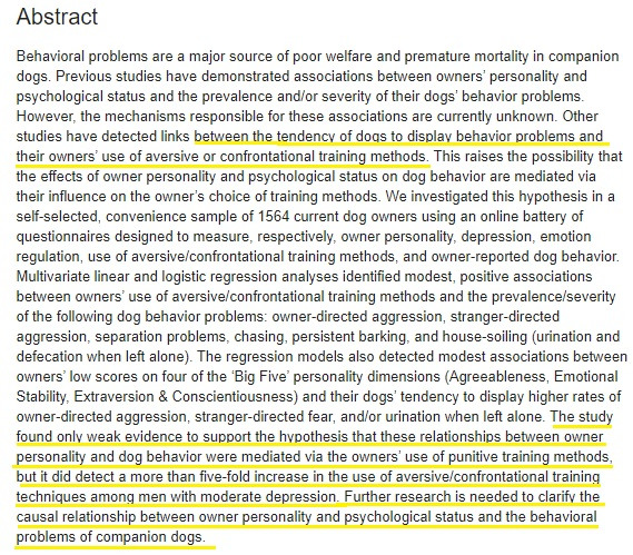 연구진은 연구를 통해 행동 문제가 있는 반려견의 보호자가 물리적 방법을 사용하여 교육하는 것과의 연관성을 확인하려 했고, 연구 결과는 보호자의 성격과 반려견의 행동문제 사이의 관계가 강압적인 교육법에 의해 생긴다는 것에 대한 것은 약간의 연관성을 보였습니다.