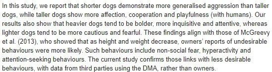 ⓐ 체고가 낮은 반려견들은 일반적으로 체고가 높은 반려견보다 공격성을 더 드러냈고, 체고가 높은 반려견이 보호자에 대한 더 많은 애정, 장난기를 보였습니다.