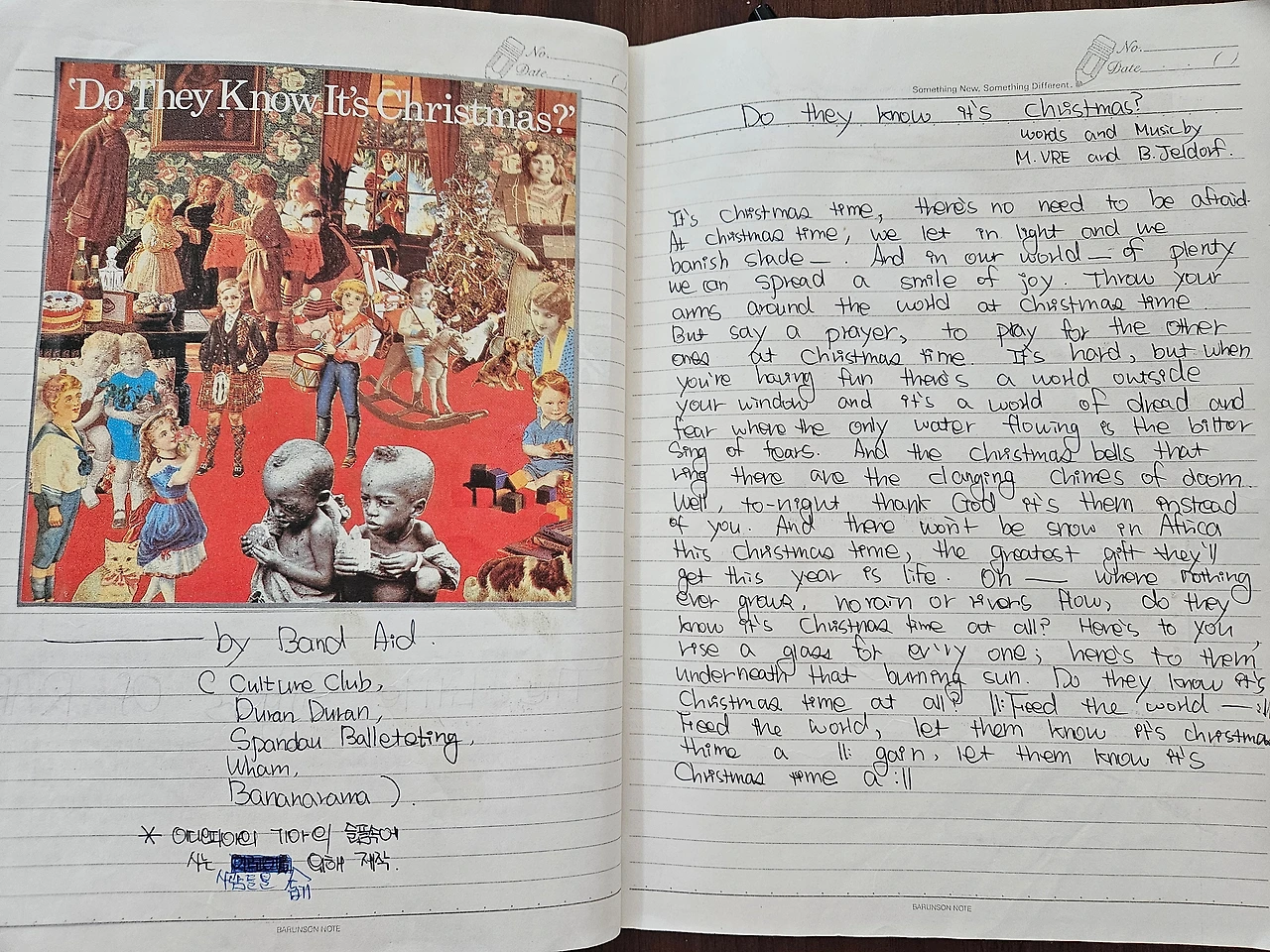 고등학생때 만든 노래 모음집(?)사람들은 이곡 보다 미국에서 뒤늦게 질세라 팝가수들이 모여 만든 'We are the world'를 더 많이 알고 좋아하는 거 같다. 이 곡도 좋지만 내 취향은 'Do they know it’s christmas?'다.
