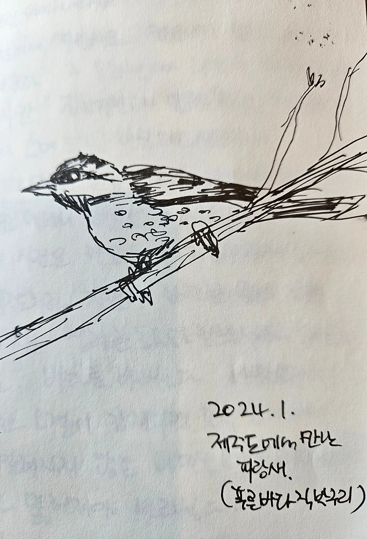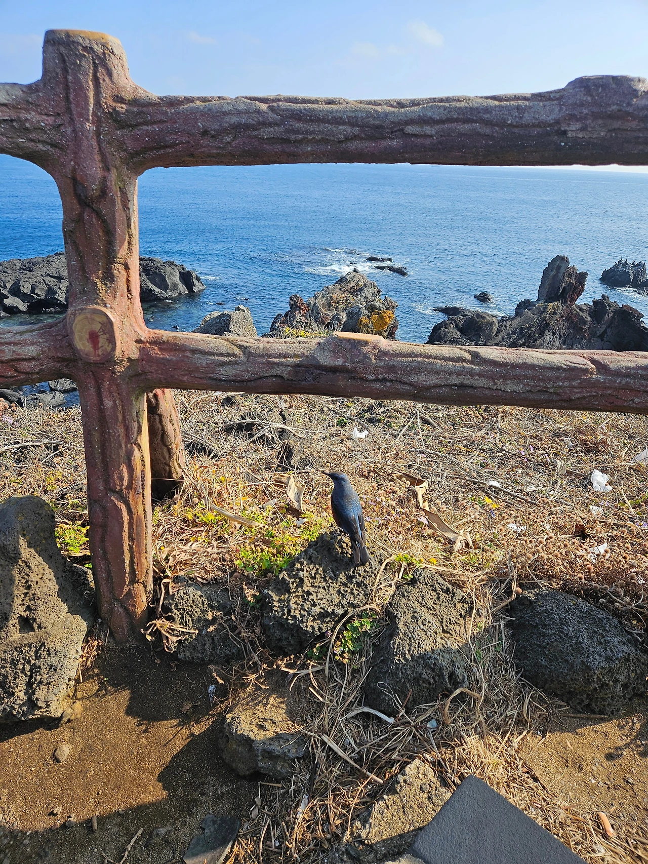 제주도에서 파랑새를 만났다. 섭지코지에서였다. 동화책에서나 나오던 파랑새가 내 눈앞에 있었다. 진한파랑과 회색, 검은색 깃털이 섞여 있는 처음 보는 아름다운 새였다. 바다색처럼 진한 파란색과 그린다고 해도 그렇게 정교하게 그리기 힘들 것 같은 비현실적인 눈매며 깃털무늬에 흥분해서 사진을 찍으려 하자 푸드득 날아갔다.