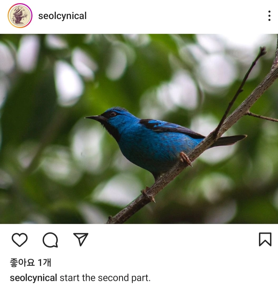 나중에 집에 와서 검색을 해보니 ‘푸른 바다직박구리’라는 이름의 새였다. 그리고 이 새와 관련된 신기한 일이 있다. 사진 갤러리를 보니 제주도 여행 가기 한 일주일 전쯤 김설 작가님이 인스타그램에 너무 예쁜 새 사진을 올리 셨길래 한 번 그려봐야지 하고 저장해 놓았는데 같은 새였다!!