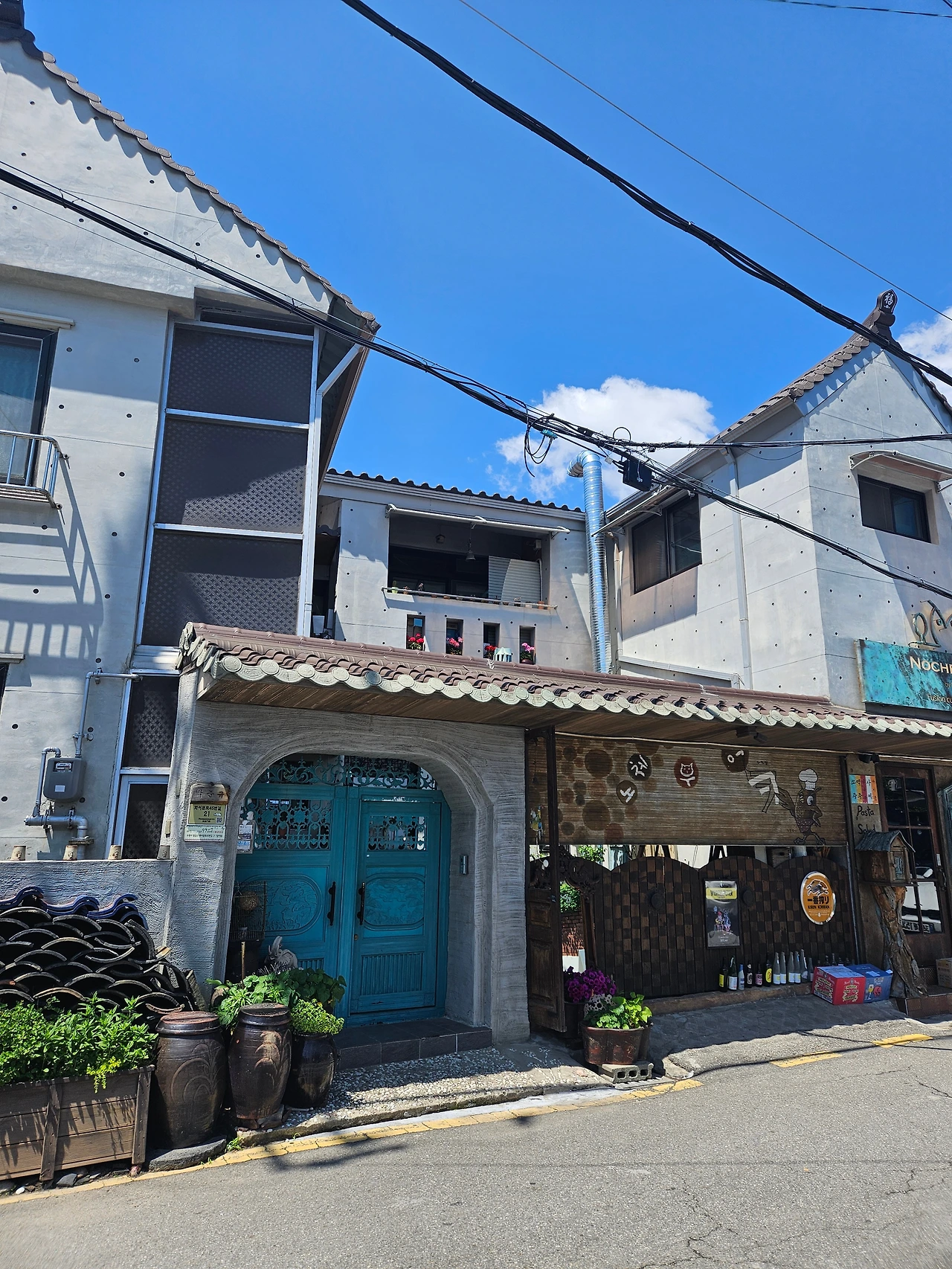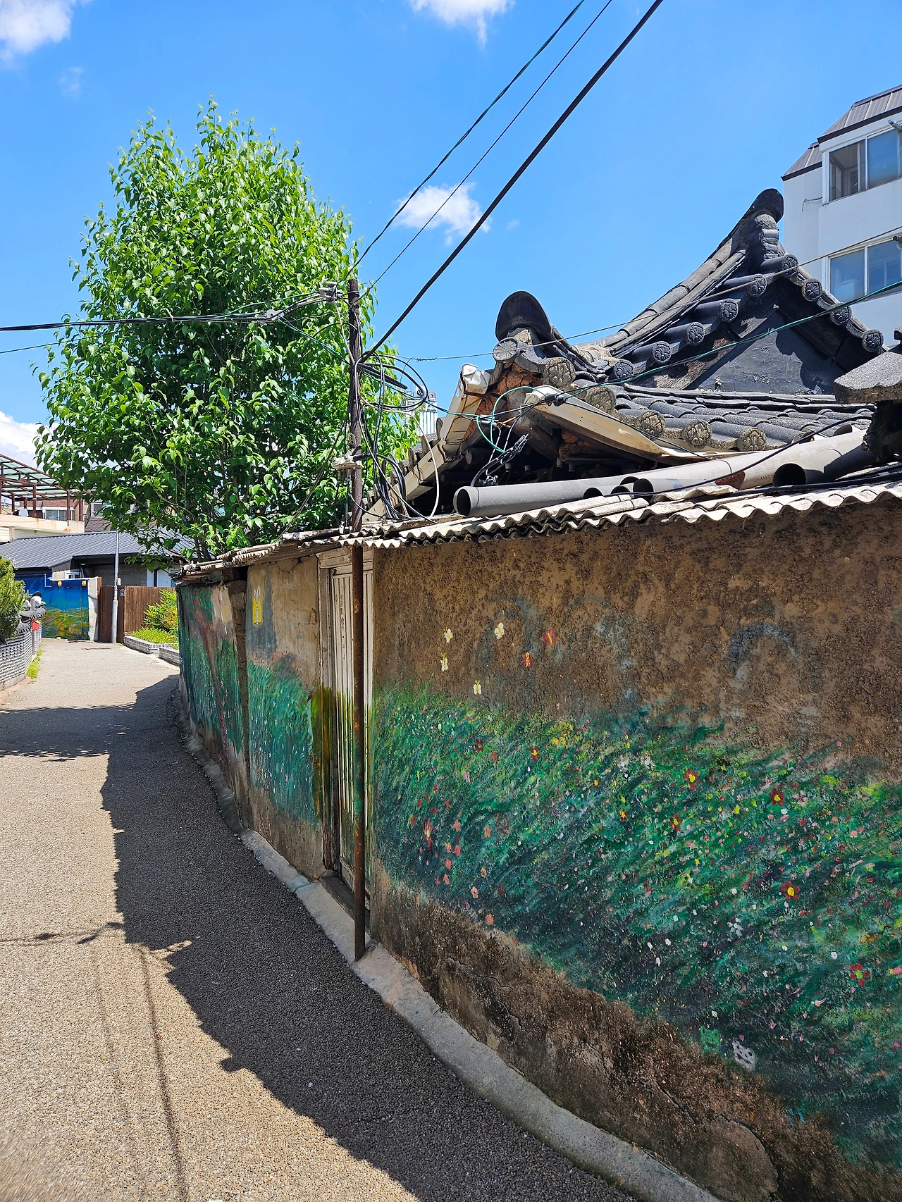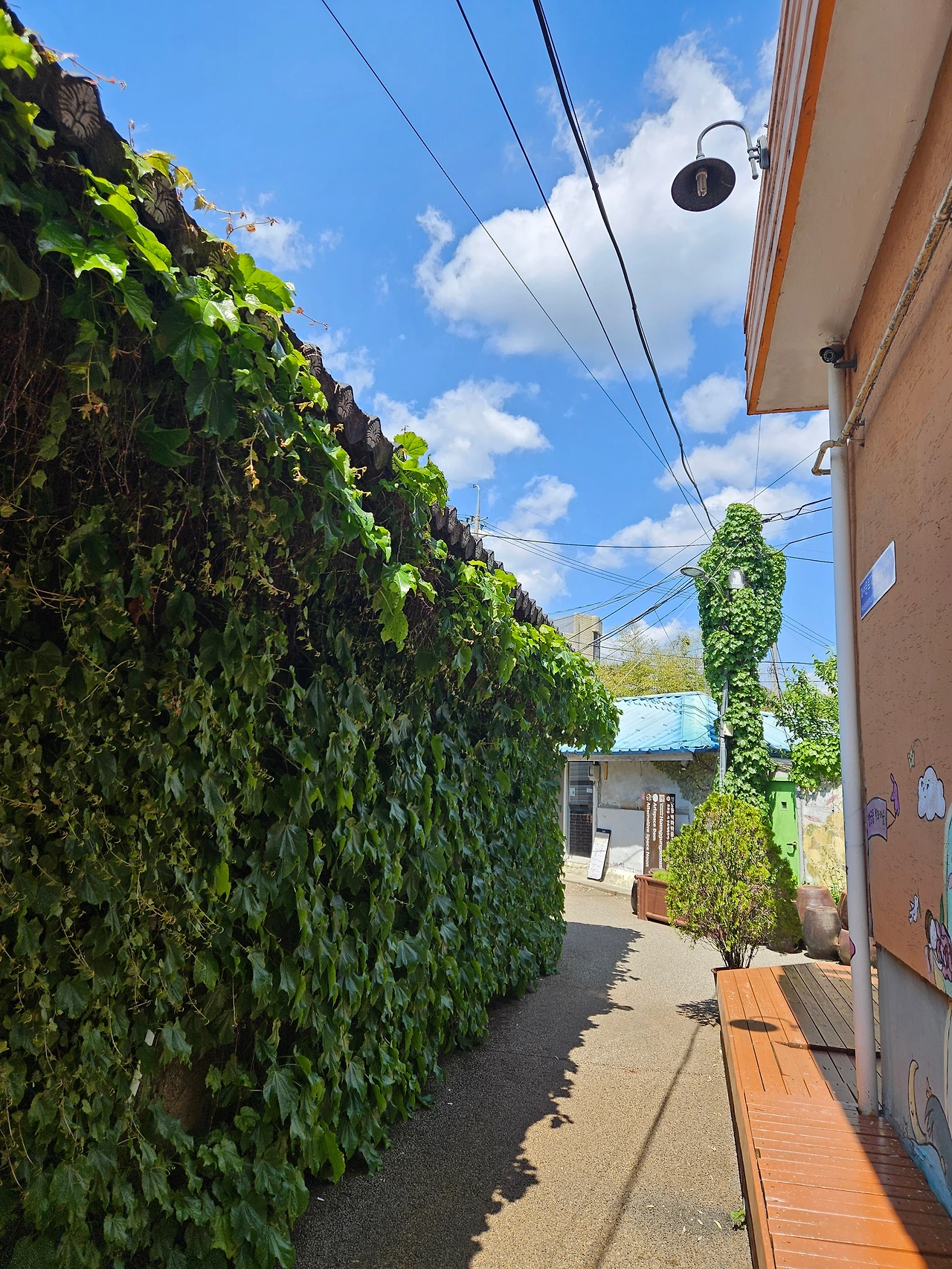 파란 대문의 집, 항아리가 조르르 늘어서있는 집 모두 잘 관리되고 있어 보였다. 아파트단지에서는 볼 수 없는 전봇대와 전깃줄마저 그림이 되는 풍경이었다.