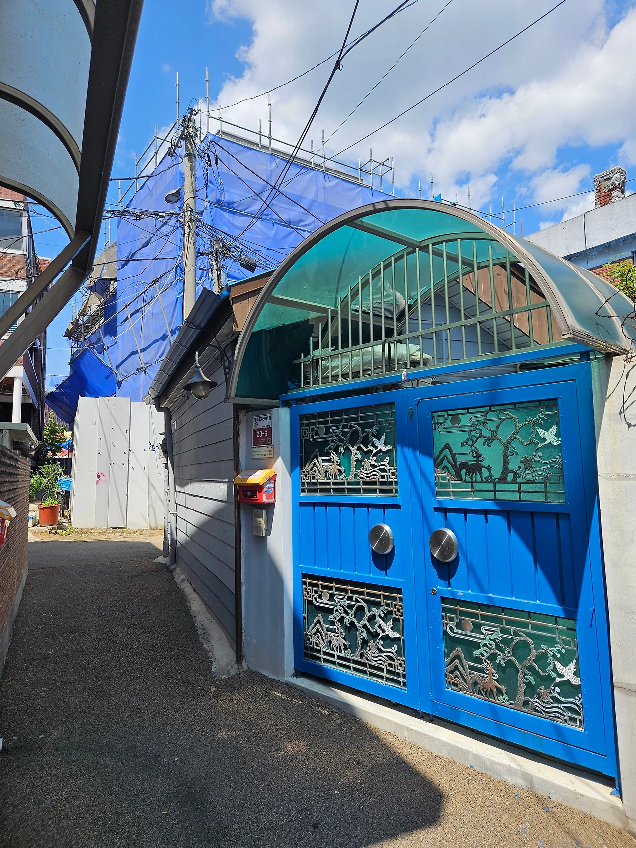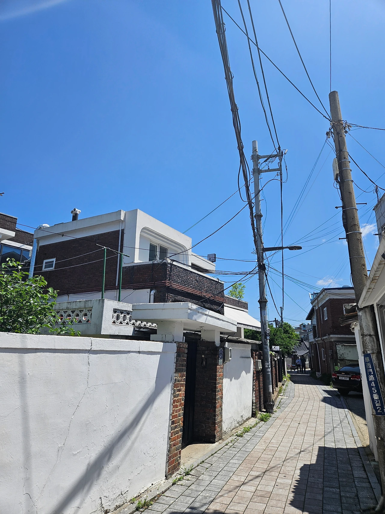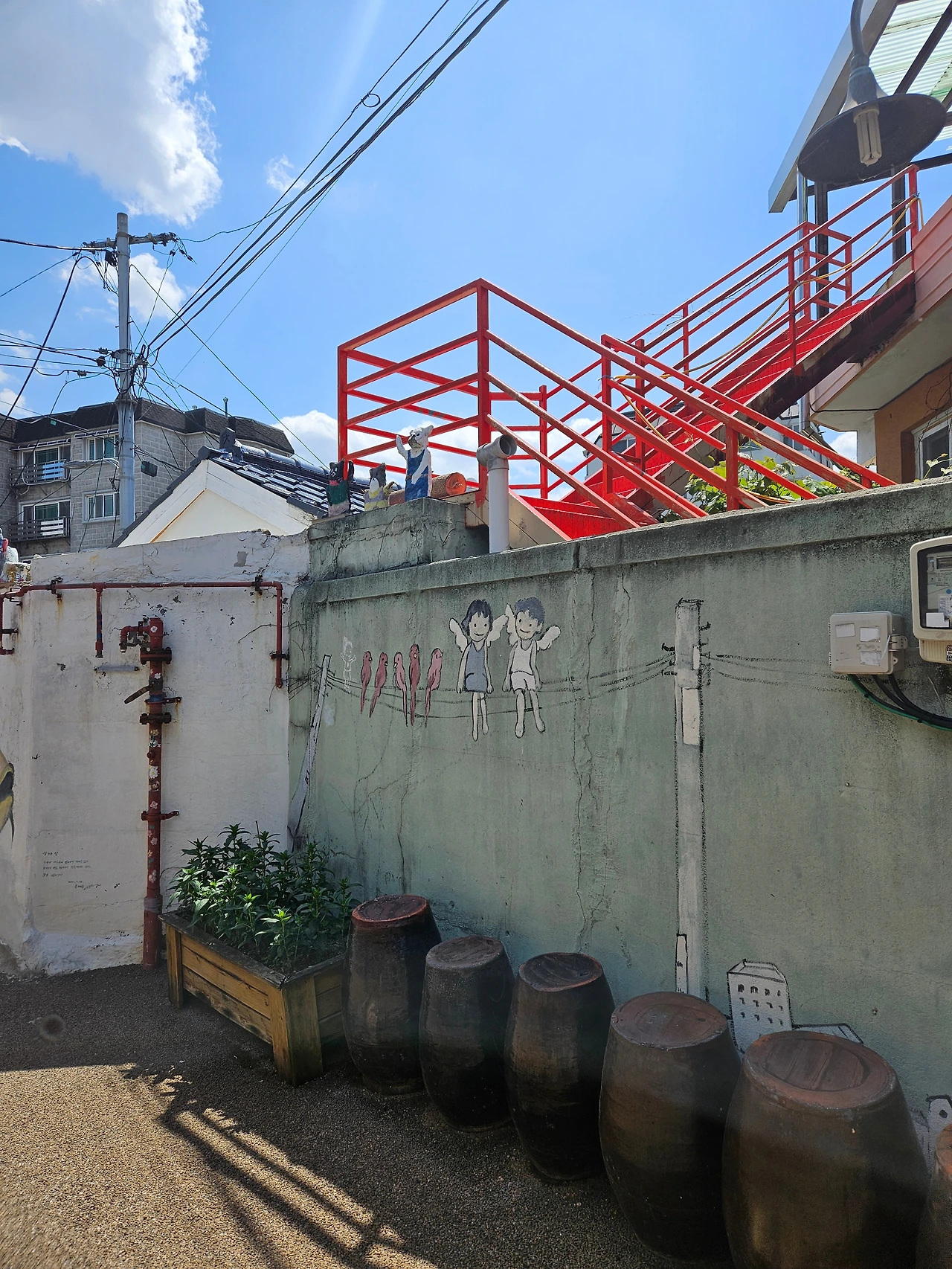 파란 대문의 집, 항아리가 조르르 늘어서있는 집 모두 잘 관리되고 있어 보였다. 아파트단지에서는 볼 수 없는 전봇대와 전깃줄마저 그림이 되는 풍경이었다.