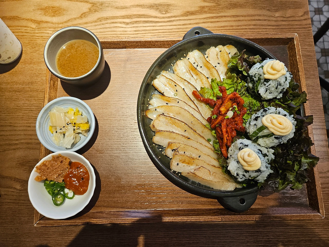 일단 오느라 오래 걸렸고 12시가 거의 돼가고 있어 사람들이 몰리기 전 얼른 혼밥을 해야겠기에 식당을 찾았다. 맛있어 보이는 중국집, 텐동집, 솥밥집 들어가 보고 싶은 식당도 참 많았다. 고민에 고민을 거듭한 후 제비곳간이라는 한식집에 들어갔다. 기력이 좀 달려서 수육을 먹기로 했다. 항정수육에 쌈밥과 오징어 무 무침이 예쁘게 데코레이션 된 한 쟁반을 받아 들었다. 보기에도 예쁜데 맛도 좋았다. 항정수육이 생각보다 덜 느끼하고 부드러워서 꿀떡꿀떡 넘어갔다.