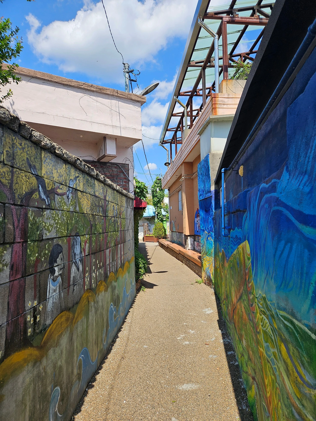 걷다 보니 내가 내렸던 버스 정류장이 다시 나왔다. 반대편으로 길을 건너보니 행궁동 벽화마을 표지판이 보였다. 여기에 벽화마을도 있었구나 하며 골목으로 들어섰다. 동화 속 세상으로 들어가듯 오래된 작은 골목길이 미로처럼 펼쳐졌다. 오래되고 낮은 집들이 오종종하게 늘어져있는 작은 골목길들이 재밌었다. 사실 벽화는 그 집들과 그다지 어울린다는 느낌은 들지 않았는데 그 작은 골목길 자체는 좋았다.