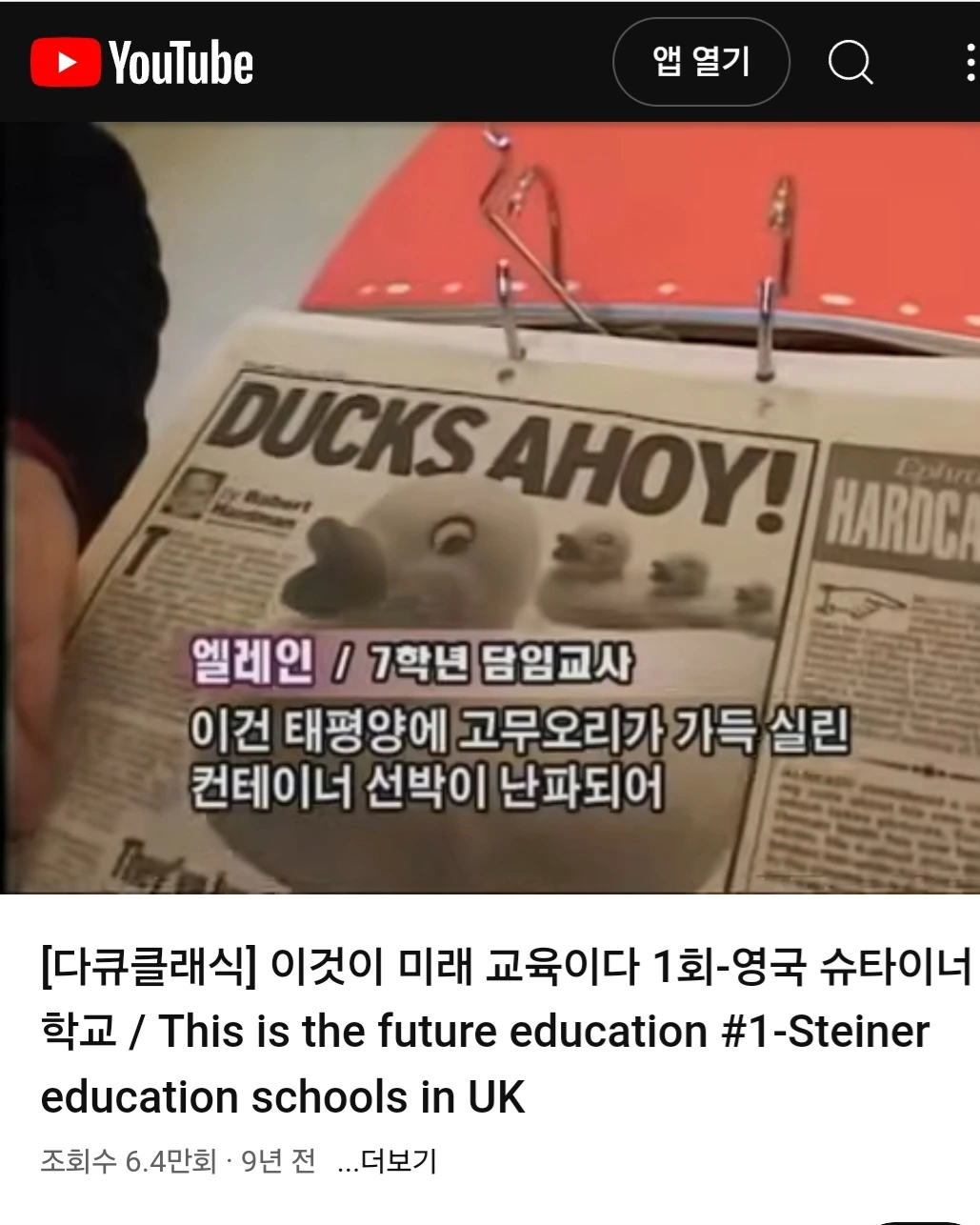 학생들에게 수업시간에 보여주었던 ebs의 다큐멘터리 중 <이것이 미래교육이다 : 1화, 영국 슈타인 학교>에서 본 내용도 계속 머릿속에 남아있다. 발도로프 프로그램을 실천하고 있는 영국 학교를 소개하는 내용이었는데 여기서 자세한 발도로프 프로그램을 소개하기보다는 나에게 인상 깊었던 내용을 소개하자면 다음과 같다.