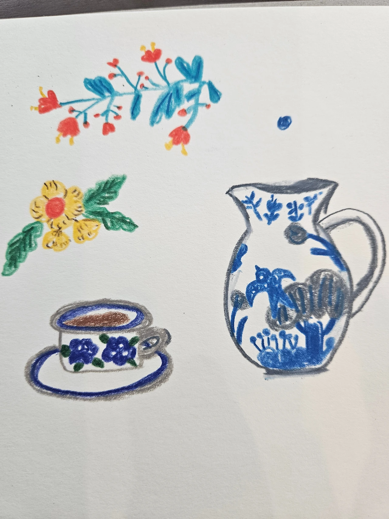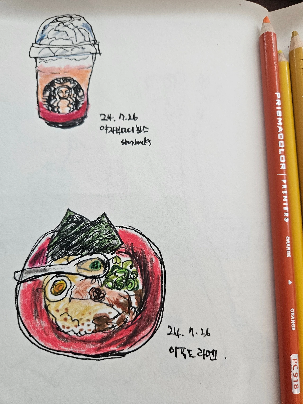 오늘도 사진 갤러리에서 얼마 전 일본 여행에서 찍은 사진들을 보며 언제 다리가 나아서 또 이렇게 여행을 가나 하다가 그때 먹었던 라멘과 음료를 그려보고 싶다는 생각이 들었다. 색연필과 작은 스케치북을 꺼내 그림을 그리는데 무척 즐거웠다. 복숭아 음료에 맞는 색을 찾아 이리저리 궁리하고 있는데 외출 준비를 하던 딸이 “엄마는 혼자서도 진짜 잘 논다. 피아노 치고 그림 그리고” 하며 웃는데 기분이 좋았다.