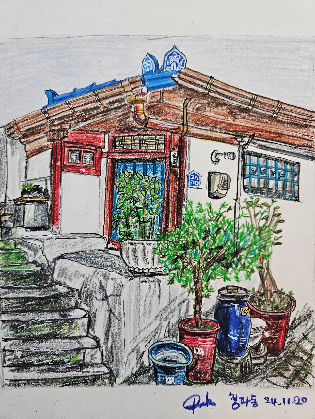 북촌 마을에서 많이 볼 수 있는 한옥도 아니고 7,80년대에 아니 더 오래전에 지어졌을지도 모르는 개성 넘치는 집들과 옆의 작은 계단들, 너무 예뻐서 사진 찍으며 “아 귀여워”라는 감탄사가 저절로 나왔다. 진짜 서울 토박이들이 살 거 같았다. 아직 개발되지 않은 이런 동네들이 사라지기 전에 부지런히 다니고 사진 찍고 그림으로 남기고 싶어서 마음이 분주해졌다.