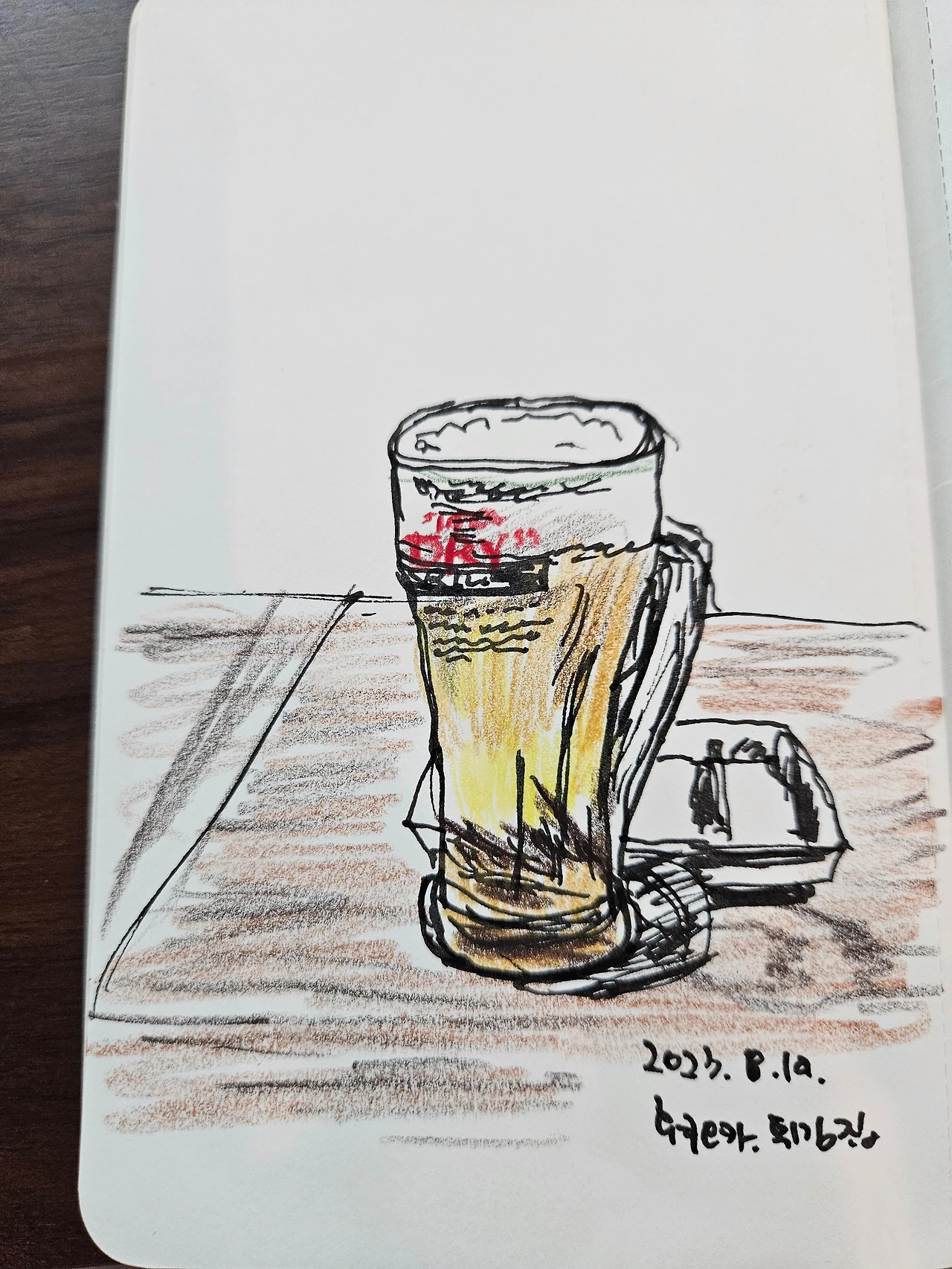 그래도 누가 맥주를 마시는 장면을 보는 것만으로도 좋아서 채널을 돌리다가도 넋 놓고 쳐다본다. 어느 날은 여행 때 찍은 사진들을 보다 일본에서 마셨던 맛있었던 맥주잔과 카스맥주병을 대충 끄적여 그려봤다. 너무 대충 그려서 완성도는 떨어졌지만 그때의 기분을 다시 느낄 수 있어서 재밌었다.